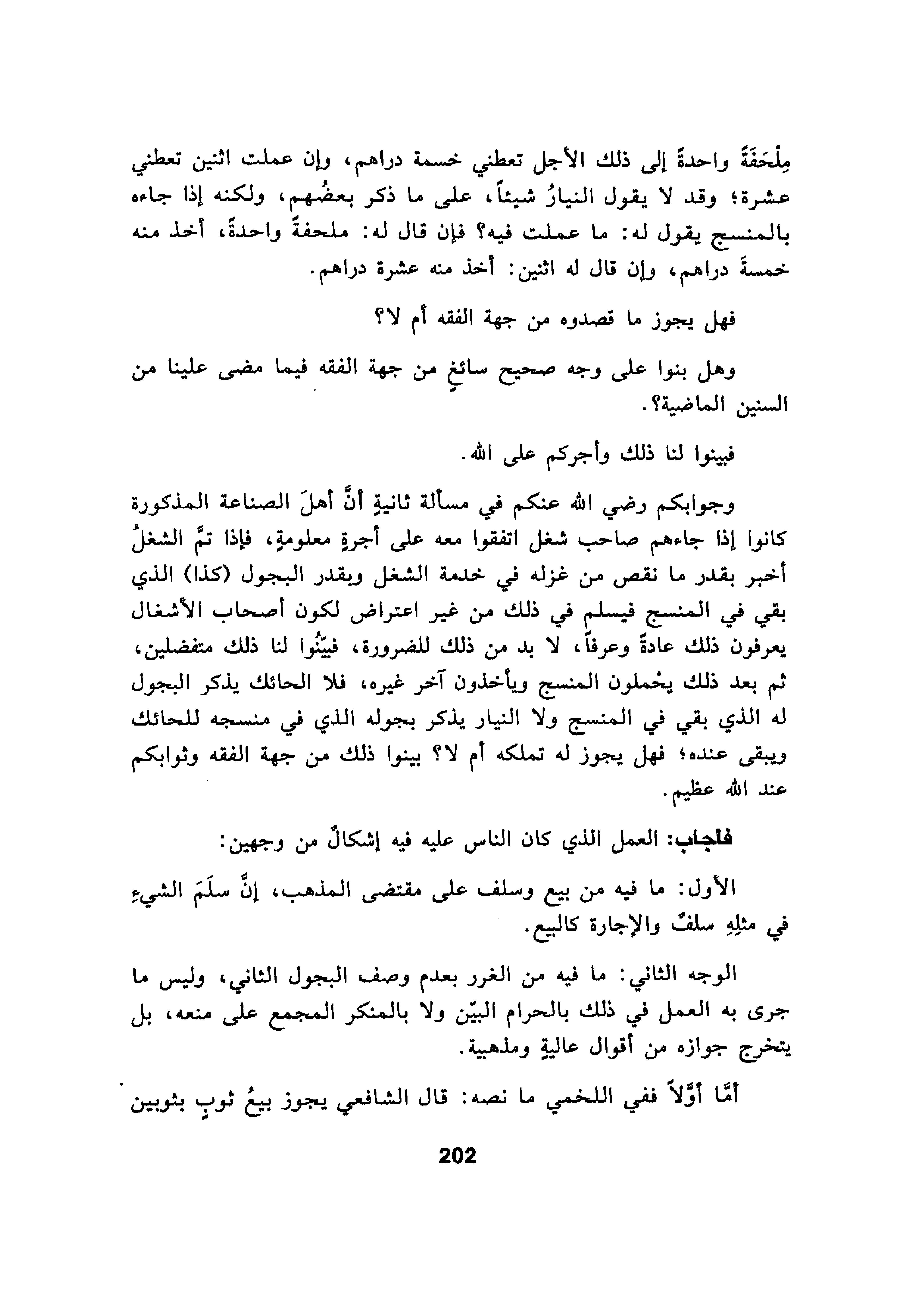 وجوابكم رضي الله عنكم في مسألة ثانيةٍ أنَّ أهلَ الصناعة المذكورة كانوا إذا جاءهم صاحب شغل اتفقوا معه على أجرةٍ معلومةٍ، فإذا تمَّ الشغلُ أخبر بقدر ما نقص من غزله في خدمة الشغل وبقدر البجول كذا الذي بقي في المنسج فيسلم في ذلك من غير اعتراض لكون أصحاب الأشغال يعرفون ذلك عادةً وعرفاً، لا بد من ذلك للضرورة، فبيّنُوا لنا ذلك متفضلين، ثم بعد ذلك يحْملون المنسج ويأخذون آخر غيره، فلا الحائك يذكر البجول له الذي بقي في المنسج ولا النيار يذكر بجوله الذي في منسجه للحائك ويبقى عنده؛ فهل يجوز له تملكه أم لا؟ بينوا ذلك من جهة الفقه وثوابكم عندالله عظيم.