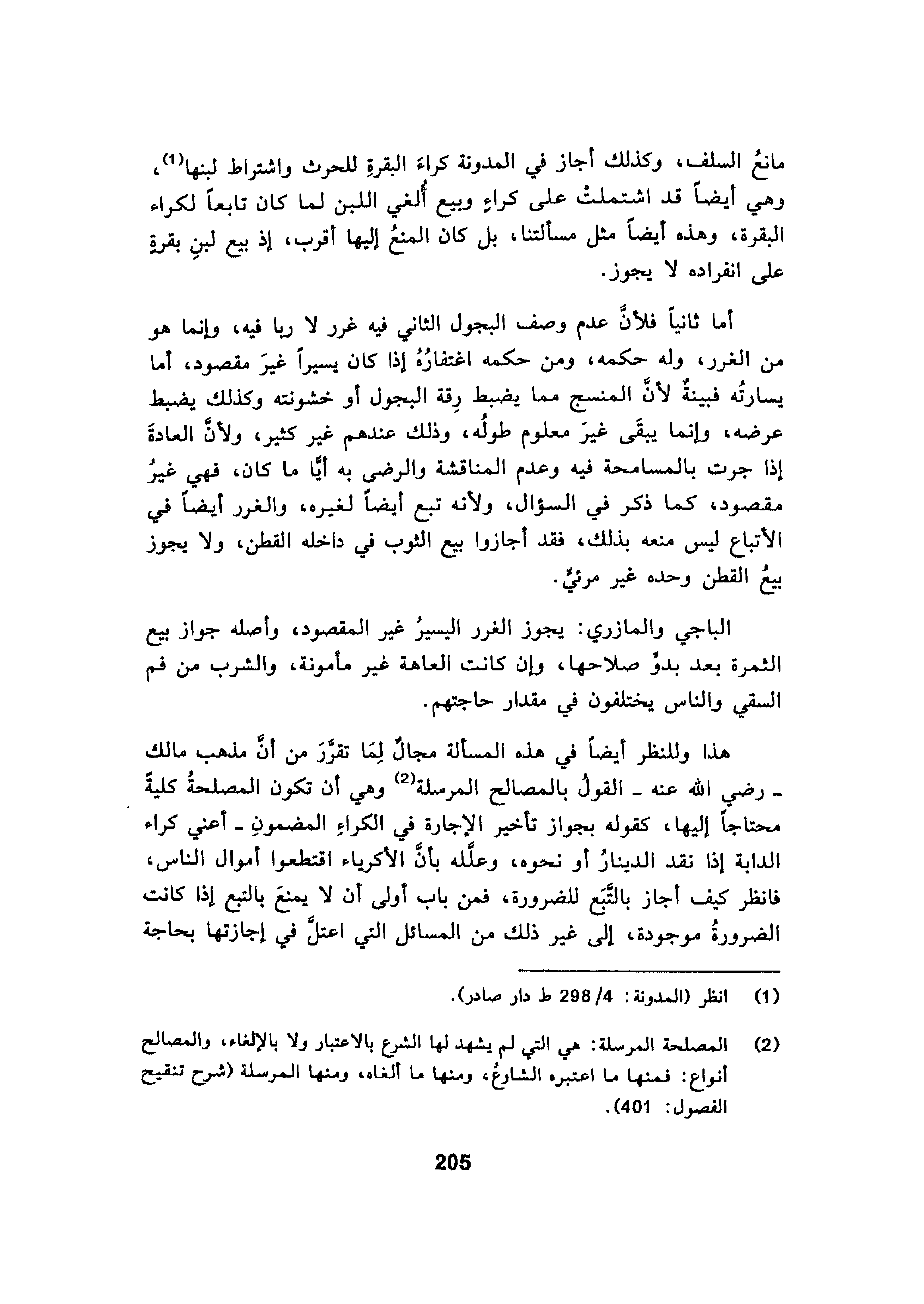 مانعُ السلف، وكذلك أجاز في المدونة كراءَ البقرةِ للحرث واشتراط لبنها، وهي أيضاً قد اشتملتْ على كراءٍ وبيع أُلغي اللبن لما كان تابعاً لكراء البقرة، وهذه أيضاً مثل مسألتنا، بل كان المنعُ إليها أقرب، إذ بيع لبنِ بقرةٍ على انفراده لا يجوز.