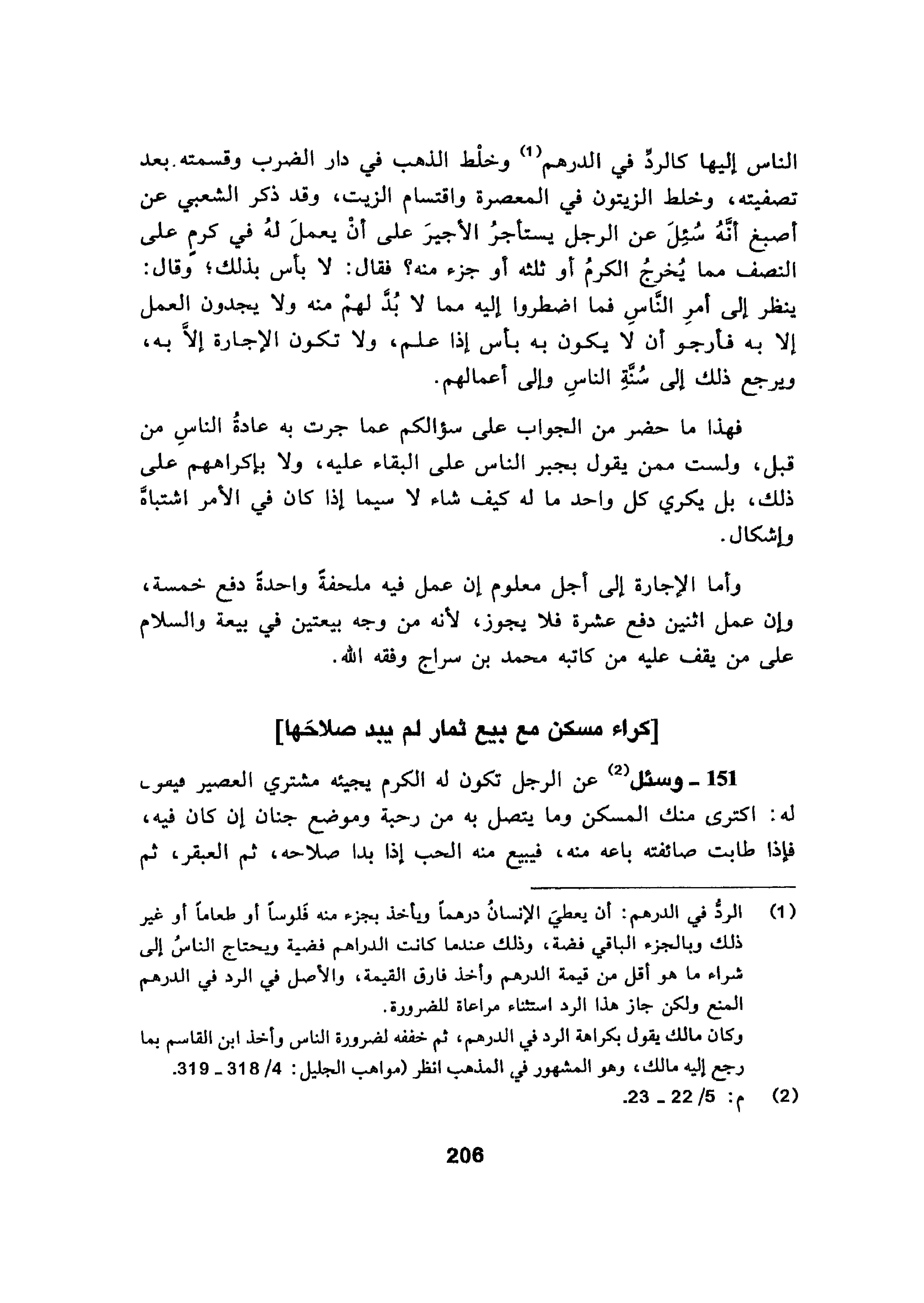 الناس إليها كالردِّ في الدرهم وخلْط الذهب في دار الضرب وقسمته بعد تصفيته، وخلط الزيتون في المعصرة واقتسام الزيت، وقد ذكر الشعبي عن أصبغ أنَّهُ سُئِلَ عن الرجل يستأجرُ الأجيرَ على أنْ يعملَ لهُ في كرمٍ على النصف مما يُخرجُ الكرمُ أو ثلثه أو جزء منه؟ فقال: لا بأس بذلك؛ وقال: ينظر إلى أمرِ النَّاسِ فما اضطروا إليه مما لا بُدَّ لهمْ منه ولا يجدون العمل إلا به فأرجو أن لا يكون به بأس إذا علم، ولا تكون الإجارة إلاَّ به، ويرجع ذلك إلى سُنَّةِ الناسِ وإلى أعمالهم.