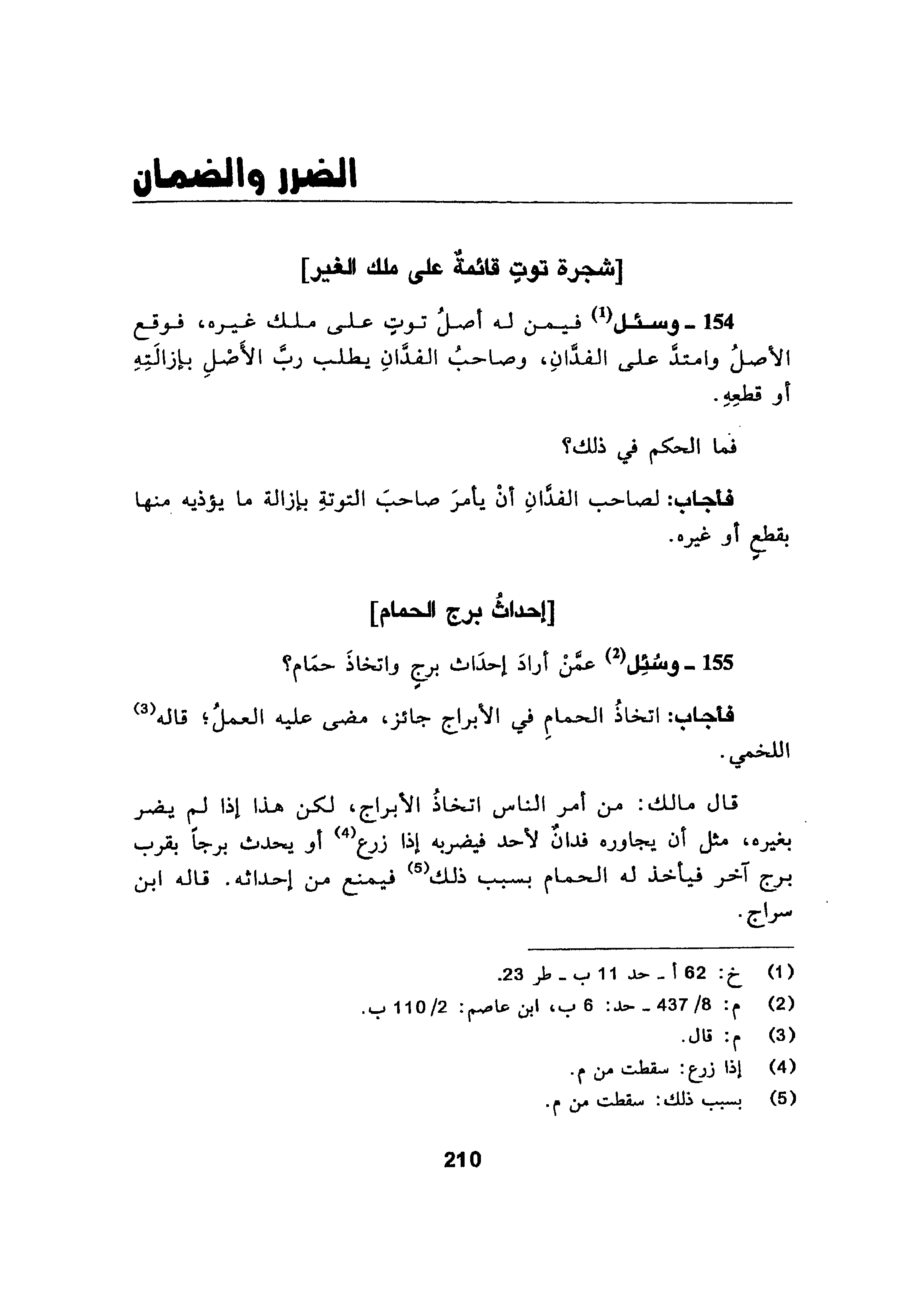 قال مالك: من أمر الناس اتخاذُ الأبراج، لكن هذا إذا لم يضر بغيره، مثل أن يجاوره فدانٌ لأحد فيضربه إذا زرع أو يحدث برجاً بقرب برج آخر فيأخذ له الحمام بسبب ذلك فيمنع من إحداثه. قاله ابن سراج.