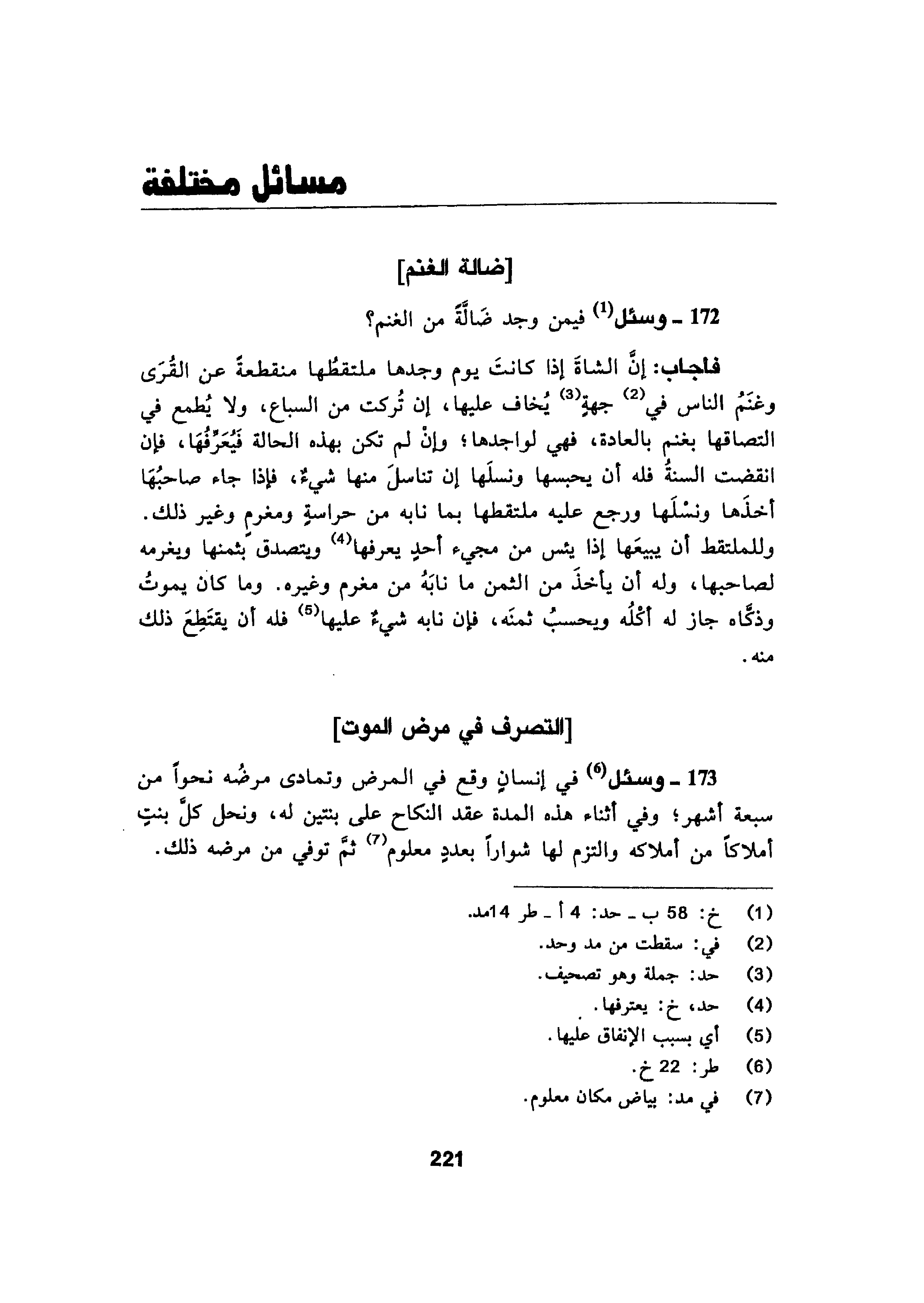 فأجاب: إنَّ الشاةَ إذا كانتَ يوم وجدها ملتقطُها منقطعةً عن القُرَى وغنَمُ الناس في جهةٍ يُخاف عليها، إن تُركت من السباع، ولا يُطمع في التصاقها بغنم بالعادة، فهي لواجدها؛ وإنْ لم تكن بهذه الحالة فَيُعَرِّفُهَا، فإن انقضت السنةُ فله أن يحبسها ونسلَها إن تناسلَ منها شيءٌ، فإذا جاء صاحبُهَا أخذَها ونسْلَها ورجع عليه ملتقطها بما نابه من حراسةٍ ومغرمٍ وغير ذلك. وللملتقط أن يبيعَها إذا يئس من مجيء أحدٍ يعرفها ويتصدق بثمنها ويغرمه لصاحبها، وله أن يأخذَ من الثمن ما نابَهُ من مغرم وغيره. وما كان يموتُ وذكَّاه جاز له أكْلُه ويحسبُ ثمنَه، فإن نابه شيءٌ عليها فله أن يقتَطِعَ ذلك منه.
