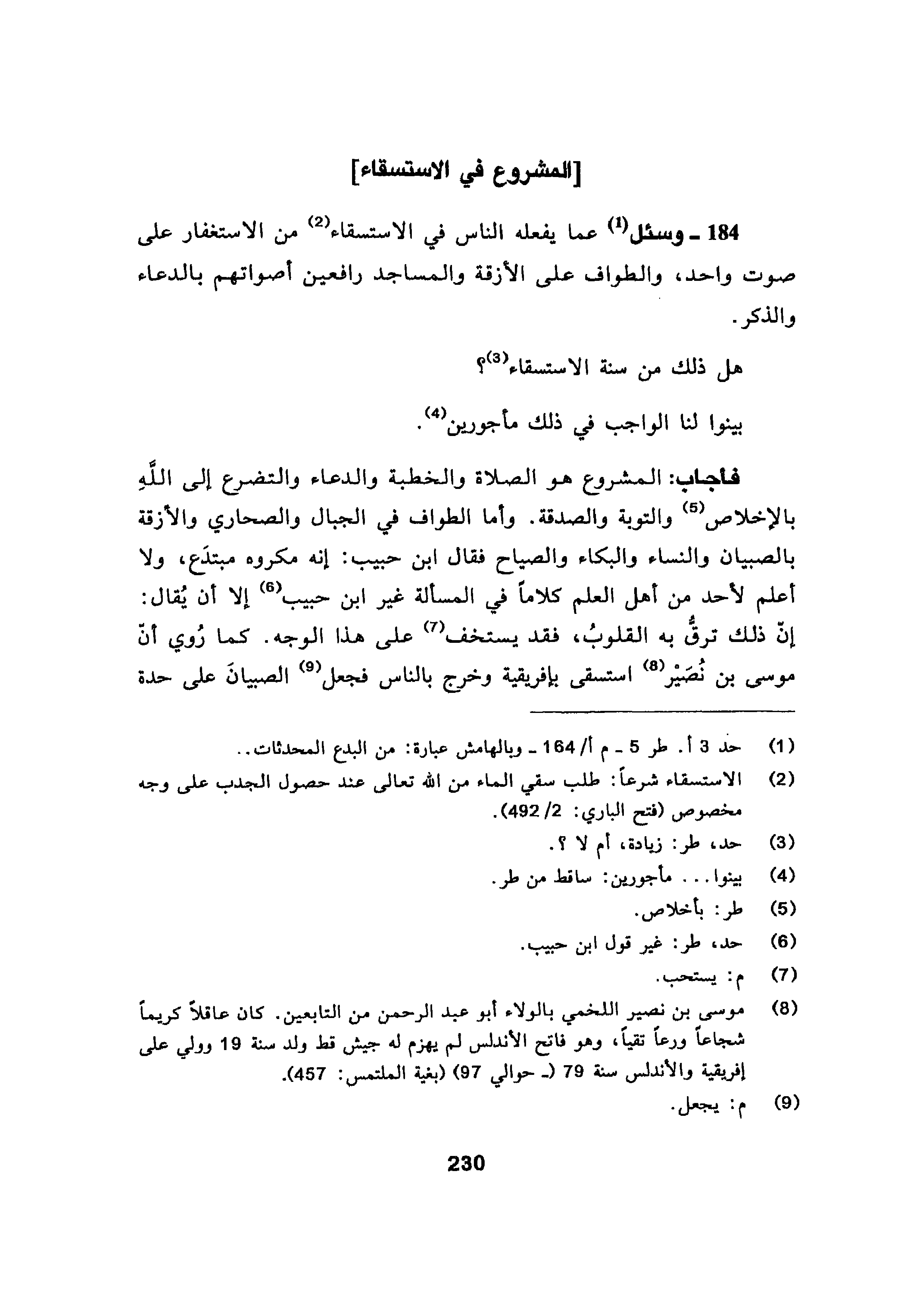 فأجاب: المشروع هو الصلاة والخطبة والدعاء والتضرع إلىاللَّهِ بالإخلاص والتوبة والصدقة. وأما الطواف في الجبال والصحاري والأزقة بالصبيان والنساء والبكاء والصياح فقال ابن حبيب: إنه مكروه مبتدَع، ولا أعلم لأحد من أهل العلم كلاماً في المسألة غير ابن حبيب إلا أن يُقال: إنّ ذلك تِرقُّ به القلوبُ، فقد يستخف على هذا الوجه. كما رُوي أنّ موسىبن نُصَيْر استسقى بإفريقية وخرج بالناس فجعل الصبيانَ على حدة