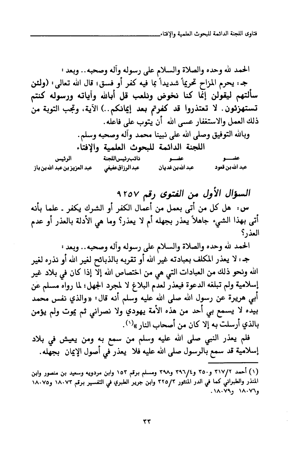 الأول والثاني والثالث وبعد الأسبوع) وقال: (واتفق الأئمة الأربعة على كراهة صنع أهل الميت طعاما للناس يجتمعون عليه) ، ونحو ذلك من أقوال العلماء. والعلماء في بلادنا فطاني بالكثرة قالوا بالعكس مما قال به العلماء العاملون السابقون، بعضهم قال بالسنة، وبعضهم قال بالمباح، وقليل منهم قال بالوجوب، فنحن أنا والحاج عبد الله الحاج محمد صالح، والحاج عبد الرحمن جافاكيا نقول كما قال به العلماء العاملون السابقون. ولأجل هذه المسألة كفر بعضهم بعضا، ولا يأكل بعضهم ذبيحة بعض، ولا ينكح بعضهم مولية بعض، ولذلك أرجو من سماحتكم الموافقة والاعتماد على ذلك بالفتوى جوابا إيجابيا، ثم ترسلون إلينا لكي نطبع ونوزع إلى الناس كافة مجانا إن شاء الله سبحانه وتعالى.