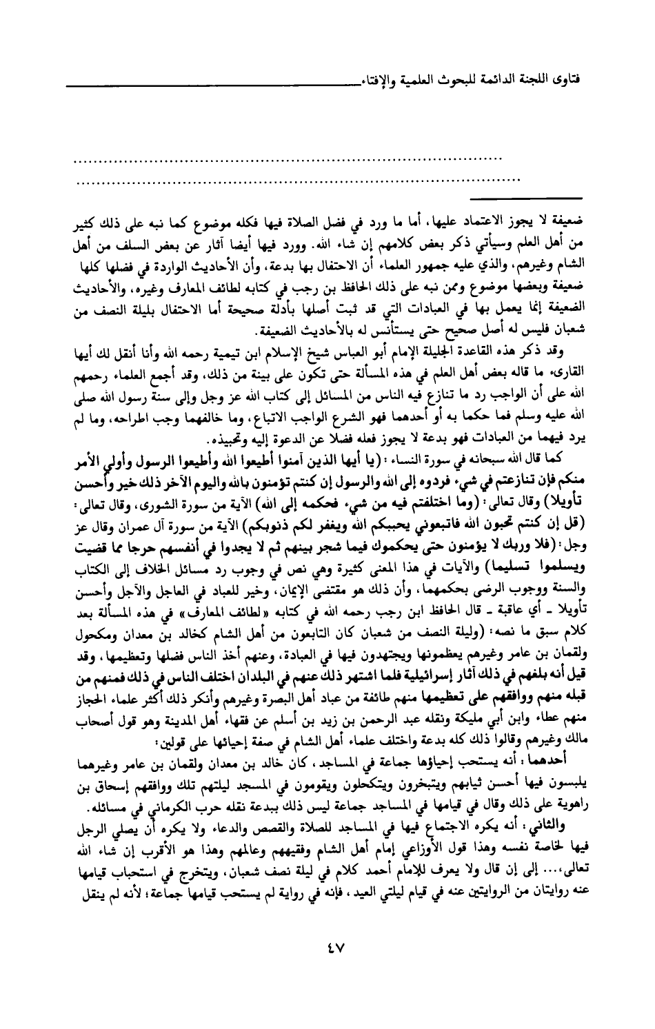 الثانية: على مبتدئ العمل بهذه الصلوات الواحدية العمل بها بالأعداد المذكورة هناك أو أكثر في مجلس كل يوم وليلة أي ساعتهما الفارغة عنده، صباحا أو مساء أو غيرهما إلى أربعين، وله اختصار الأربعين بسبعة أيام لكن مع تضعيف الأعداد المذكورة عشرة، فالسبعة سبعين والمائة بألف والثلاثة بثلاثين + وإذا فات قضى ما فاته ثم بعد إتمام الأربعين أو السبعة اتخذها وردا، أي يداوم على العمل بها كل يوم وليلة، أي ساعتهما الفارغة عنده، والأحسن في الأعداد للورد بالزيادة المذكورة؛ لأنها على الأقل والإمداد غالبا بحسب الاستعداد، ولمن اتخذها وردا نقص الأعداد من الكل أو البعض أو نقص بعض وزيادة بعض وللمبتدئ وغيره العمل بها جماعة أفضل، والحائض والنفساء لا تقرأ عند العمل بها بالفاتحة، ولا بآيات القرآن بنيته.