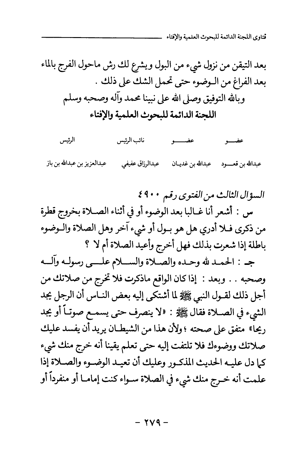 س 2: في بعض الأوقات ينزل مني ماء أبيض وفي بعض الأحيان وأنا أصلي فهل أقطع الصلاة وأتوضأ أم أكمل صلاتي وهل هذا الماء يكون نجسا ويجب علي الاستحمام منه أم أطهر نفسي فقط فهو في حين نزوله يخرج خارج مني فهل أغير ملابسي أم لا وهل هذا الماء به ضرر لي، فهو ينزل مني قبل الحيض وبعده وفي أيام متصلة ببعضها. وفي أي وقت فهو ينزل مني وإن كنت ذاهبة إلى المسجد وقد اغتسلت غسل الجمعة حين أمشي وأكون ذاهبة إلى المسجد لأصلي فهو ينزل مني فماذا أفعل هل لا أدخل المسجد وأصلي أم أدخل لكي أستمع إلى الخطبة ولا أصلي. فماذا تفتي بهذا الماء الأبيض؟