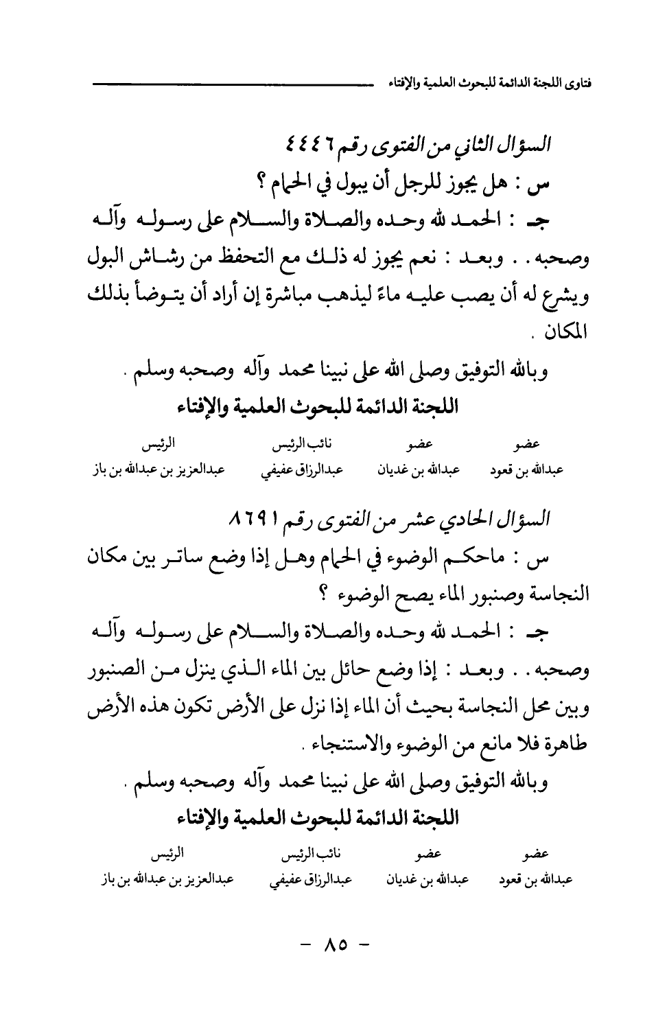 س 1: ما حكم الشريعة في اغتسال الجنب في الماء الدائم الذي لا يجري مع العلم بأنه يوجد في البر برك يستمر فيها الماء مدة طويلة لا يغيره إلا المطر في الصيف أو الخريف وتوجد برك في المساجد وما حكم النهي في حديث «لا يغتسل أحدكم في الماء الدائم وهو جنب» وما حكم مرتكب النهي ثم إن أهل القرى يأتون إلى هذه البرك ويكشفون عوراتهم بعضهم على بعض برفع الإزار إلى ما فوق الركبة.