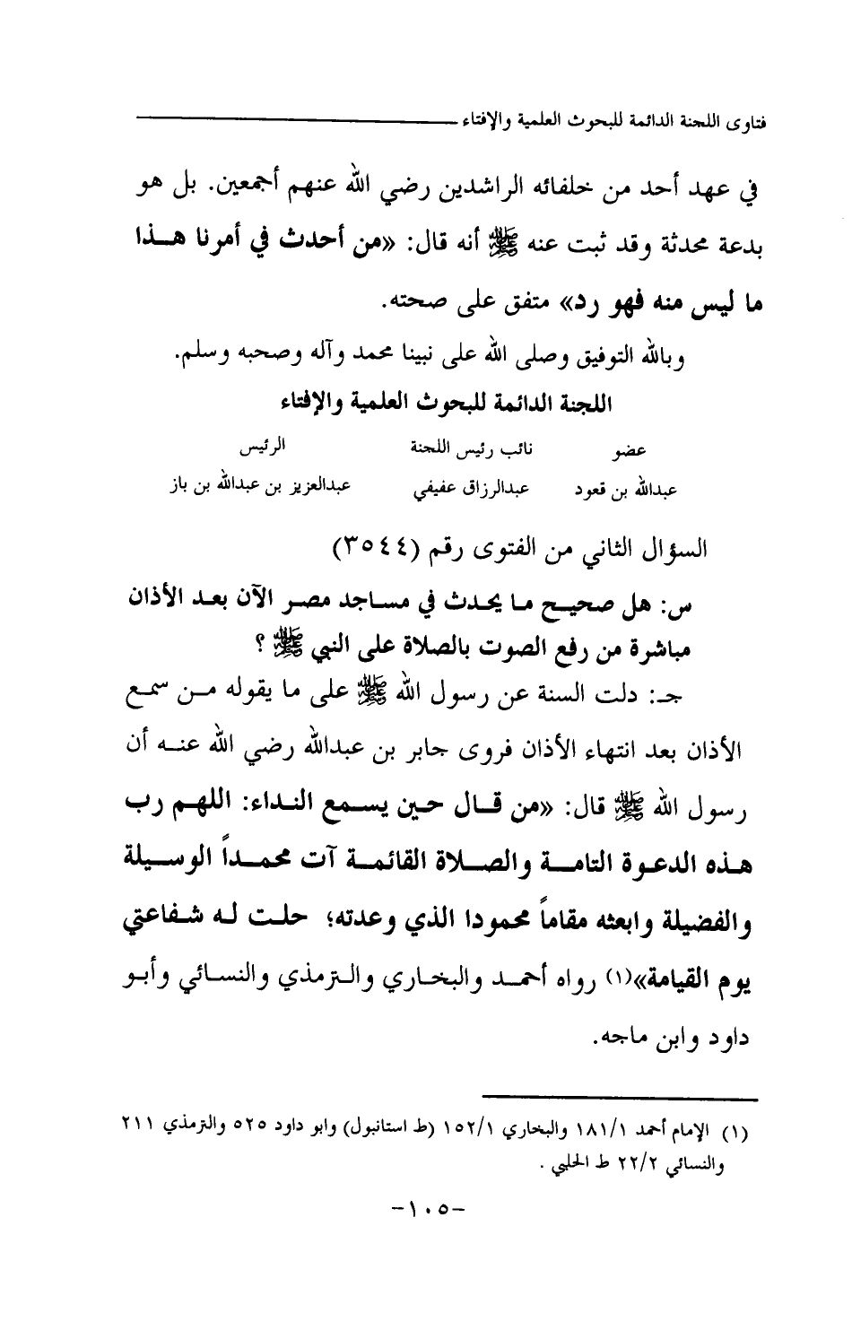 رسول الله صلى الله عليه وسلم أنه قال: «من عمل عملا ليس عليه أمرنا فهو رد (¬1) » ولكن يشرع بعد الأذان للمؤذن وغيره أن يصلي على النبي صلى الله عليه وسلم ثم يقول: اللهم رب هذه الدعوة التامة والصلاة القائمة، آت محمدا الوسيلة والفضيلة، وابعثه مقاما محمودا الذي وعدته، لما ثبت عن النبي صلى الله عليه وسلم أنه قال: «إذا سمعتم المؤذن فقولوا مثل ما يقول ثم صلوا علي فإنه من صلى علي صلاة واحدة صلى الله عليه بها عشرا ثم سلوا الله لي الوسيلة فإنها منزلة في الجنة لا تنبغي إلا لعبد من عباد الله وأرجو أن أكون أنا هو فمن سأل لي الوسيلة حلت له الشفاعة (¬2) » رواه مسلم.