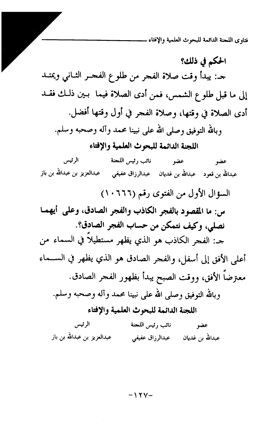 فقد اطلعت اللجنة الدائمة للبحوث العلمية والإفتاء على السؤال المقدم من رابطة العالم الإسلامي إلى سماحة الرئيس العام والمحال إليها برقم 641 في 6 \ 4 \ 1401هـ ونصه: بالإشارة إلى خطاب معالي وزير الحج والأوقاف رقم 2620 \ ع في 28 \ 11 \ 1400هـ الموجه لمعاليكم ومشفوعه خطاب معالي وزير الأوقاف والشئون والمقدسات الإسلامية في الأردن المتضمن أن الوقت الذي يدخل فيه صلاة الفجر هو تبين الخيط الأبيض من الخيط الأسود من الفجر. وأن المختصين بالدراسات الفلكية في الأردن أفادوا بأن الفجر على ثلاثة أقسام: الفجر الفلكي، والفجر البحري، والفجر