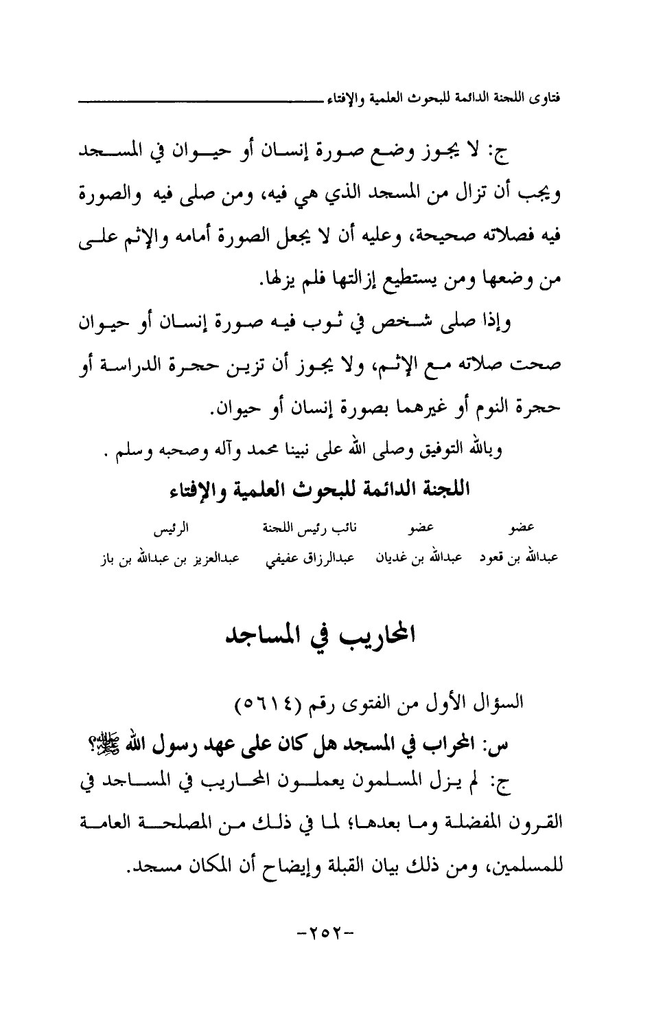 فقد اطلعت اللجنة الدائمة للبحوث العلمية والإفتاء على الاستفتاء المقدم لسماحة الرئيس العام من مدير أوقاف ومساجد منطقة الجوف برقم 1576 في 3 \ 9 \ 1409هـ ونصه: يقوم المواطن حمود بن عقلا الفلاح بإنشاء مسجد شرق حي الشلهوب بمدينة سكاكا الجوف على حسابه جزاه الله خيرا وبموجب شروط ومواصفات ومخططات وترخيص، إلا أنه عندما أراد عمل جورة الامتصاص (بيارة المسجد) طلبت منه البلدية عملها داخل حوش المسجد.