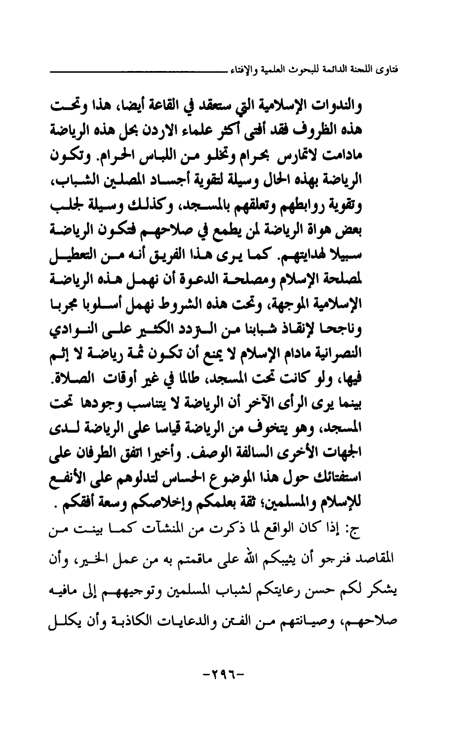 ج4: يجوز جمع التبرعات المالية في المسجد للجمعيات الخيرية؛ لما في ذلك من التعاون على البر والخير، وقد قال الله تعالى: {وَتَعَاوَنُوا عَلَى الْبِرِّ وَالتَّقْوَى} (¬1) فأما بيع الكتب الإسلامية بالمساجد فلا يجوز، سواء كان هذا في فرنسا أم غيرها؛ لقول النبي صلى الله عليه وسلم: «إذا رأيتم من يبيع في المسجد فقولوا لا أربح الله تجارتك (¬2) » ولما في ذلك من اتخاذها أسواقا، وهي لم تبن لذلك، إنما بنيت لعبادة الله وذكر الله وتعليم العلم ونحو ذلك، فينبغي أن تصان عما فيه صخب ورفع الأصوات ومثار الجدل والنزاع في شئون