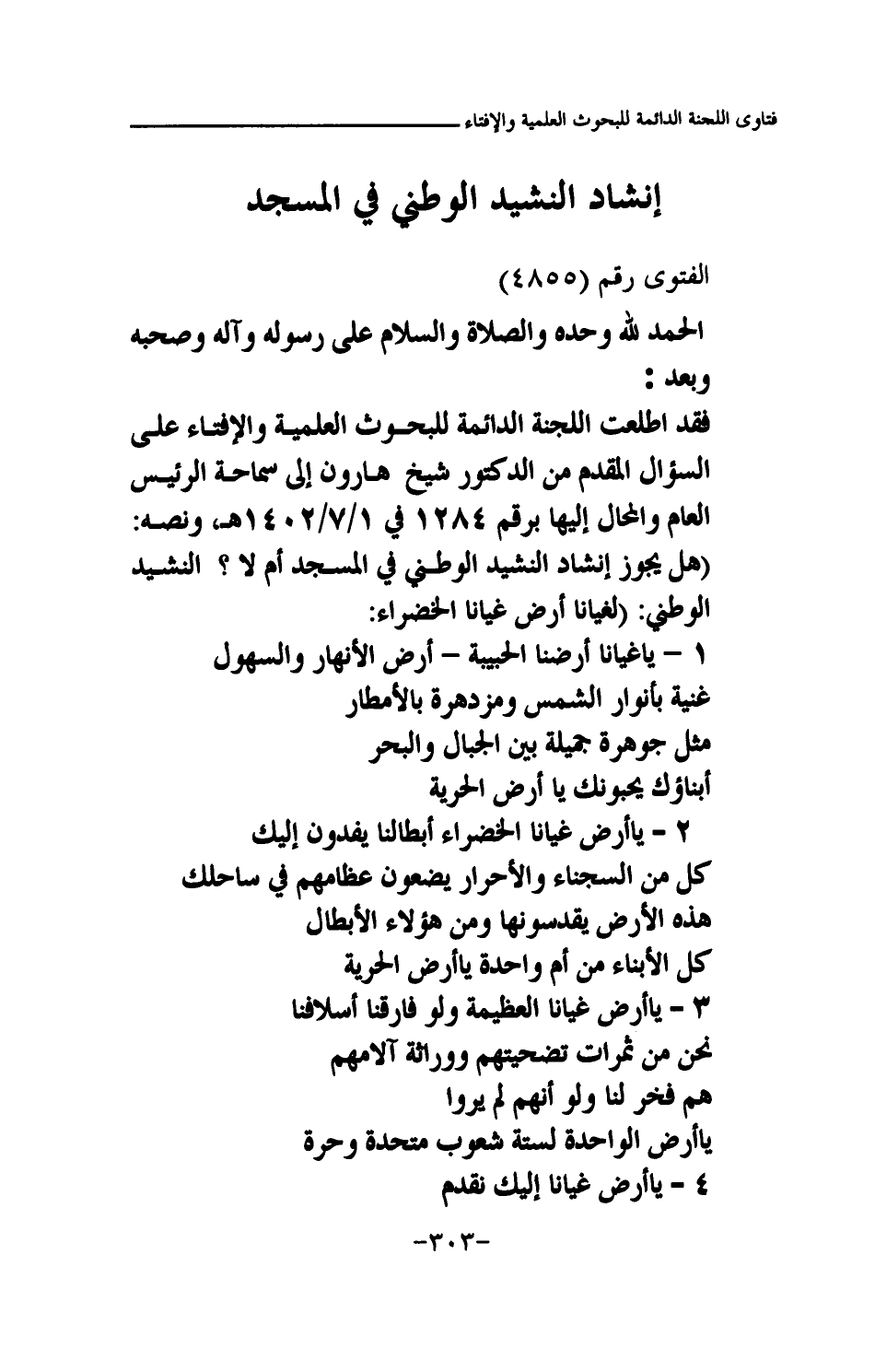 س: يقوم بعض المواطنين بالإنهاء عن بعض ممتلكاتهم رغبة الحصول على صكوك تملك، وتقوم المحكمة بإرسال نسخة من الإنهاء لإمام المسجد بغرض إعلانها لأهالي القرية وإعلامهم بذلك، ويقوم إمام المسجد بقراءة ذلك الإنهاء داخل المسجد وعقب الصلاة مباشرة، ويحدث في أحيان كثيرة أن يحدث ذلك الإنهاء الكثير من الأخذ والرد والمشادة بين المصلين داخل المسجد، وقد ارتأى عدد من الأفراد أن يكتفي الإمام بعد صلاة الجمعة بأن يعلن للمصلين أنه سيتم بعد السنة قراءة إنهاء لفلان من الناس ويسميه لهم في حرم المسجد، فمن كان شريكا أو مجاورا أو له حق لدى ذلك المنهي أو يرغب سماع الإنهاء فيمكنه ذلك في حرم المسجد بعد السنة، أما المسجد فلم يبن لذلك، وقراءة الإنهاء داخل المسجد وما يستتبعه ذلك لما أشرنا إليه يحدث البلبلة والهرج الذي لا خير فيه.