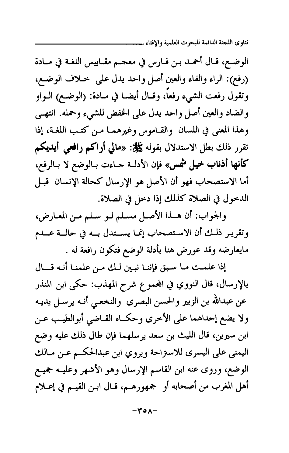 الثالث: أن هذا الحديث ورد على سبب خاص؛ فعن جابر بن سمرة رضي الله عنه قال: «كنا إذا صلينا مع النبي صلى الله عليه وسلم قلنا: السلام عليكم ورحمة الله السلام عليكم ورحمة الله وأشار بيده إلى الجانبين، فقال لهم النبي صلى الله عليه وسلم: علام تومؤن بأيديكم كأنها أذناب خيل شمس اسكنوا في الصلاة إنما يكفي أحدكم أن يضع يديه على فخذيه ثم يسلم على أخيه من عن يمينه ومن عن شماله (¬1) » رواه مسلم. وإذا تقرر أنه وارد على سبب خاص فالقاعدة المقررة في علم الأصول في هذا الباب أن العبرة بعموم اللفظ لا بخصوص السبب، ولكن ورد ما يدل على عدم تناول هذا العموم لمسألة قبض الشمال باليمين وإذا تعارض عام وخاص أخرج الخاص من العام؛ لأن تناول الخاص لمدلوله أقوى من تناول العام لهذا المدلول