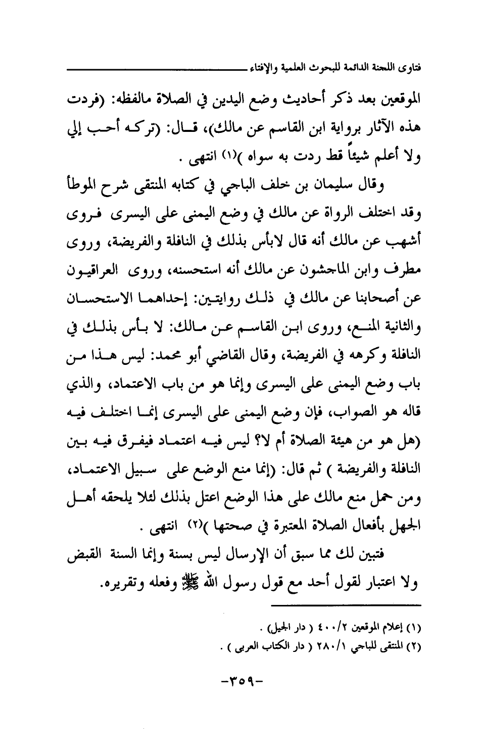 الخامس: إذا ورد دليل عام وأجمع الصحابة على خلافه أو خلاف بعض مدلوله علمنا أنهم لم يجمعوا إلا على أساس مستند اقتضى ذلك، وقد قال النبي صلى الله عليه وسلم: «لا تجتمع أمتي على ضلالة (¬1) » وهذا الحديث متواتر معنى فإنه ورد من طرق كثيرة عن كثير من الصحابة بألفاظ مختلفة ترجع إلى معنى هذا اللفظ الذي ذكرناه وبناء على ذلك فقد سبق نقل الإجماع عن الترمذي في هذه المسألة، وحكى الحافظ ابن حجر عن ابن عبد البر أنه قال: لم يأت عن النبي صلى الله عليه وسلم فيه خلاف، والذي حكاه ابن حجر عن ابن عبد البر هو قوله: وهو أمر مجمع عليه في هيئة وضع اليدين إحداهما على الأخرى فعلم بذلك عدم تناول العموم له.