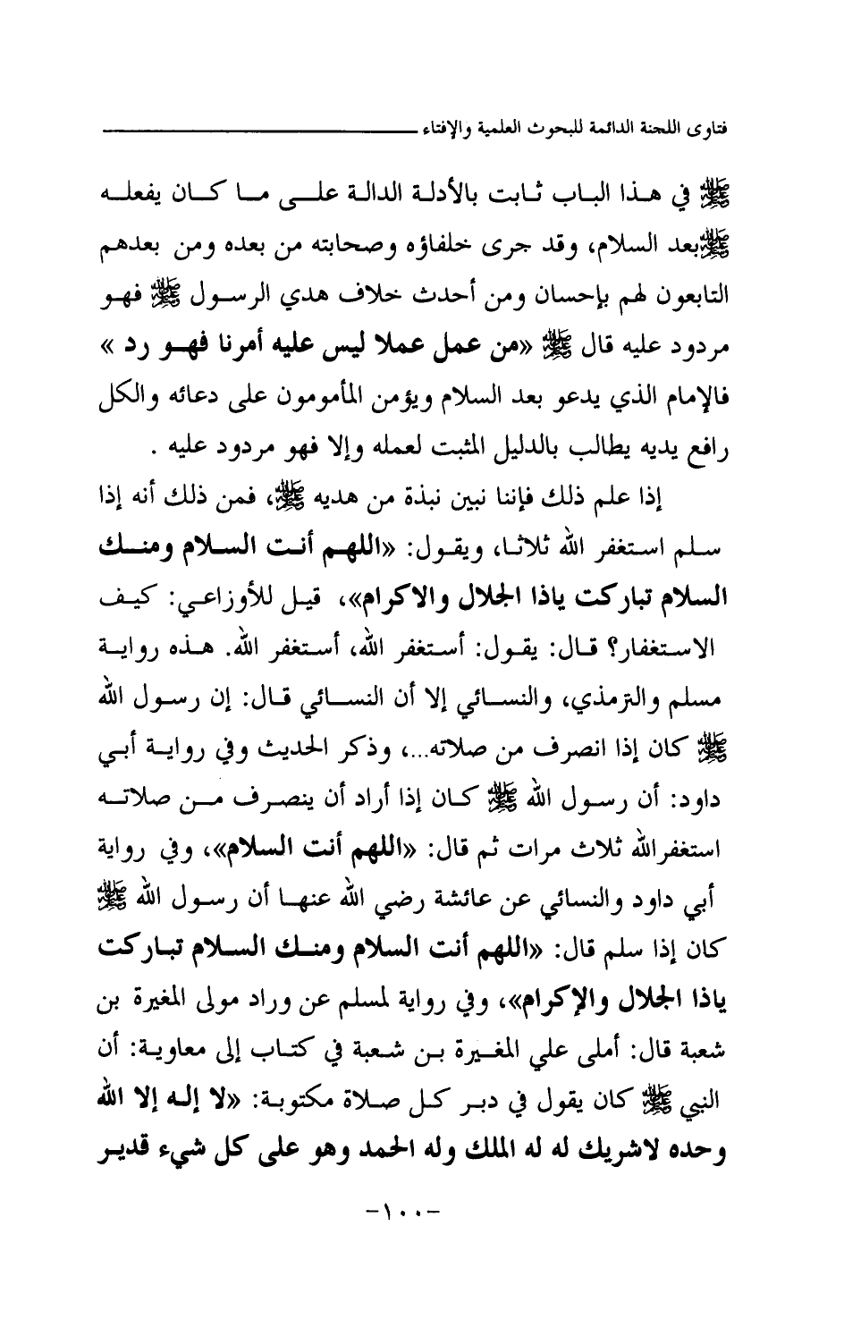صلى الله عليه وسلم في هذا الباب ثابت بالأدلة الدالة على ما كان يفعله صلى الله عليه وسلم بعد السلام، وقد جرى خلفاؤه وصحابته من بعده ومن بعدهم التابعون لهم بإحسان ومن أحدث خلاف هدي الرسول صلى الله عليه وسلم فهو مردود عليه قال صلى الله عليه وسلم «من عمل عملا ليس عليه أمرنا فهو رد (¬1) » فالإمام الذي يدعو بعد السلام ويؤمن المأمومون على دعائه والكل رافع يديه يطالب بالدليل المثبت لعمله وإلا فهو مردود عليه.