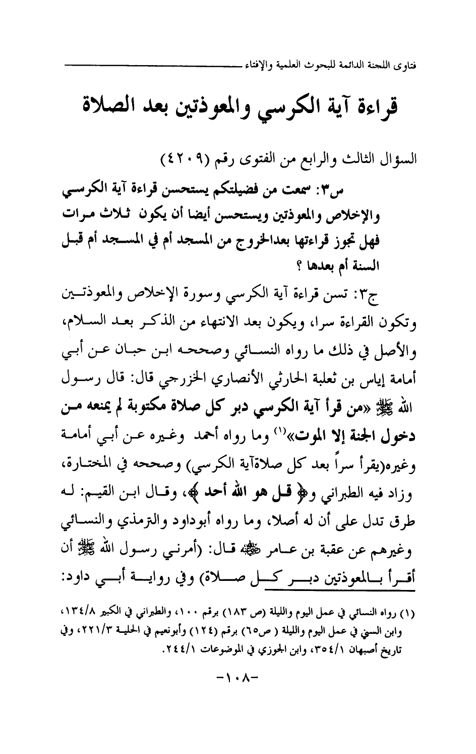 س3: سمعت من فضيلتكم يستحسن قراءة آية الكرسي والإخلاص والمعوذتين ويستحسن أيضا أن يكون ثلاث مرات فهل تجوز قراءتها بعد الخروج من المسجد أم في المسجد أم قبل السنة أم بعدها؟