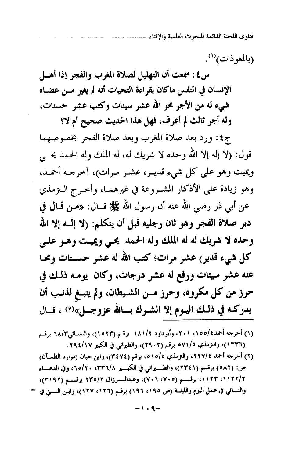 ج4: ورد بعد صلاة المغرب وبعد صلاة الفجر بخصوصهما قول: «لا إله إلا الله وحده لا شريك له، له الملك وله الحمد يحي ويميت وهو على كل شيء قدير، عشر مرات (¬1) » ، أخرجه أحمد وهو زيادة على الأذكار المشروعة في غيرهما، وأخرج الترمذي عن أبي ذر رضي الله عنه أن رسول الله صلى الله عليه وسلم قال: «من قال في دبر صلاة الفجر وهو ثان رجليه قبل أن يتكلم: (لا إله إلا الله وحده لا شريك له له الملك وله الحمد يحي ويميت وهو على كل شيء قدير) عشر مرات؛ كتب الله له عشر حسنات ومحا عنه عشر سيئات ورفع له عشر درجات، وكان يومه ذلك في حرز من كل مكروه، وحرز من الشيطان، ولم ينبغ لذنب أن يدركه في ذلك اليوم إلا الشرك بالله عز وجل (¬2) » قال