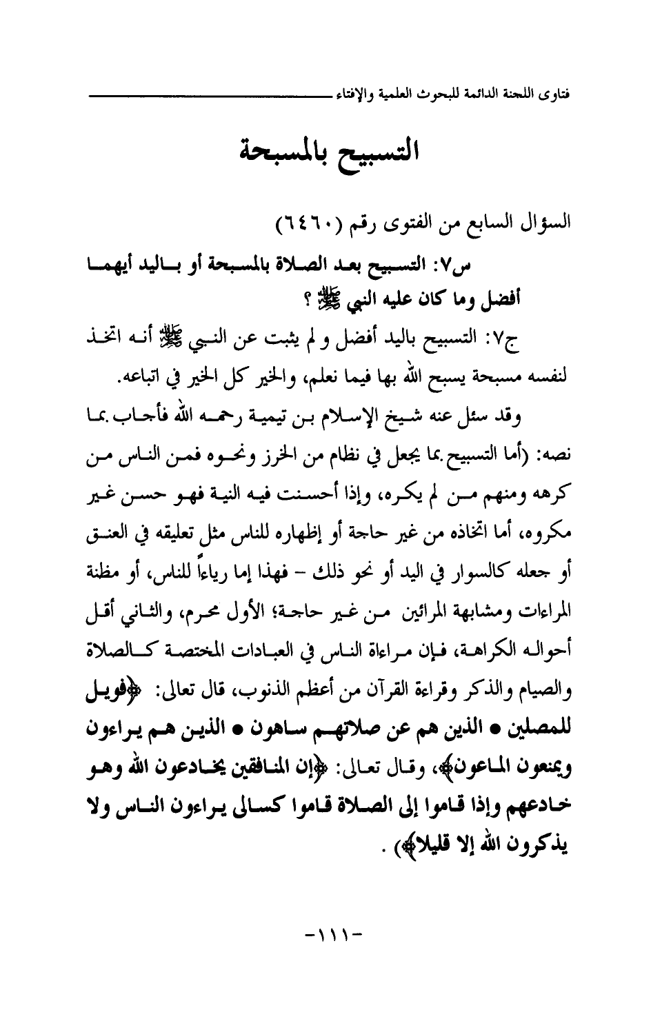 وقد سئل عنه شيخ الإسلام ابن تيمية رحمه الله فأجاب بما نصه: أما التسبيح بما يجعل في نظام من الخرز ونحوه فمن الناس من كرهه ومنهم من لم يكره، وإذا أحسنت فيه النية فهو حسن غير مكروه، أما اتخاذه من غير حاجة أو إظهاره للناس مثل تعليقه في العنق أو جعله كالسوار في اليد أو نحو ذلك - فهذا إما رياءا للناس، أو مظنة المراءاة ومشابهة المرائين من غير حاجة؛ الأول محرم، والثاني أقل أحواله الكراهة، فإن مراءاة الناس في العبادات المختصة كالصلاة والصيام والذكر وقراءة القرآن من أعظم الذنوب، قال تعالى: {فَوَيْلٌ لِلْمُصَلِّينَ} (¬1) {الَّذِينَ هُمْ عَنْ صَلَاتِهِمْ سَاهُونَ} (¬2) {الَّذِينَ هُمْ يُرَاءُونَ} (¬3) {وَيَمْنَعُونَ الْمَاعُونَ} (¬4) وقال تعالى: {إِنَّ الْمُنَافِقِينَ يُخَادِعُونَ اللَّهَ وَهُوَ خَادِعُهُمْ وَإِذَا قَامُوا إِلَى الصَّلَاةِ قَامُوا كُسَالَى يُرَاءُونَ النَّاسَ وَلَا يَذْكُرُونَ اللَّهَ إِلَّا قَلِيلًا} (¬5)