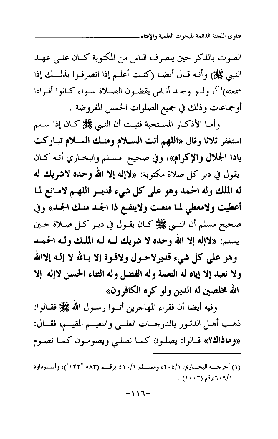 وأما الأذكار المستحبة فثبت أن النبي صلى الله عليه وسلم كان إذا سلم استغفر ثلاثا وقال «اللهم أنت السلام ومنك السلام تباركت يا ذا الجلال والإكرام (¬3) » ، وفي صحيح مسلم والبخاري أنه كان يقول في دبر كل صلاة مكتوبة: «لا إله إلا الله وحده لا شريك له له الملك وله الحمد وهو على كل شيء قدير اللهم لا مانع لما أعطيت ولا معطي لما منعت ولا ينفع ذا الجد منك الجد (¬4) » وفي صحيح مسلم «أن النبي صلى الله عليه وسلم كان يقول في دبر كل صلاة حين