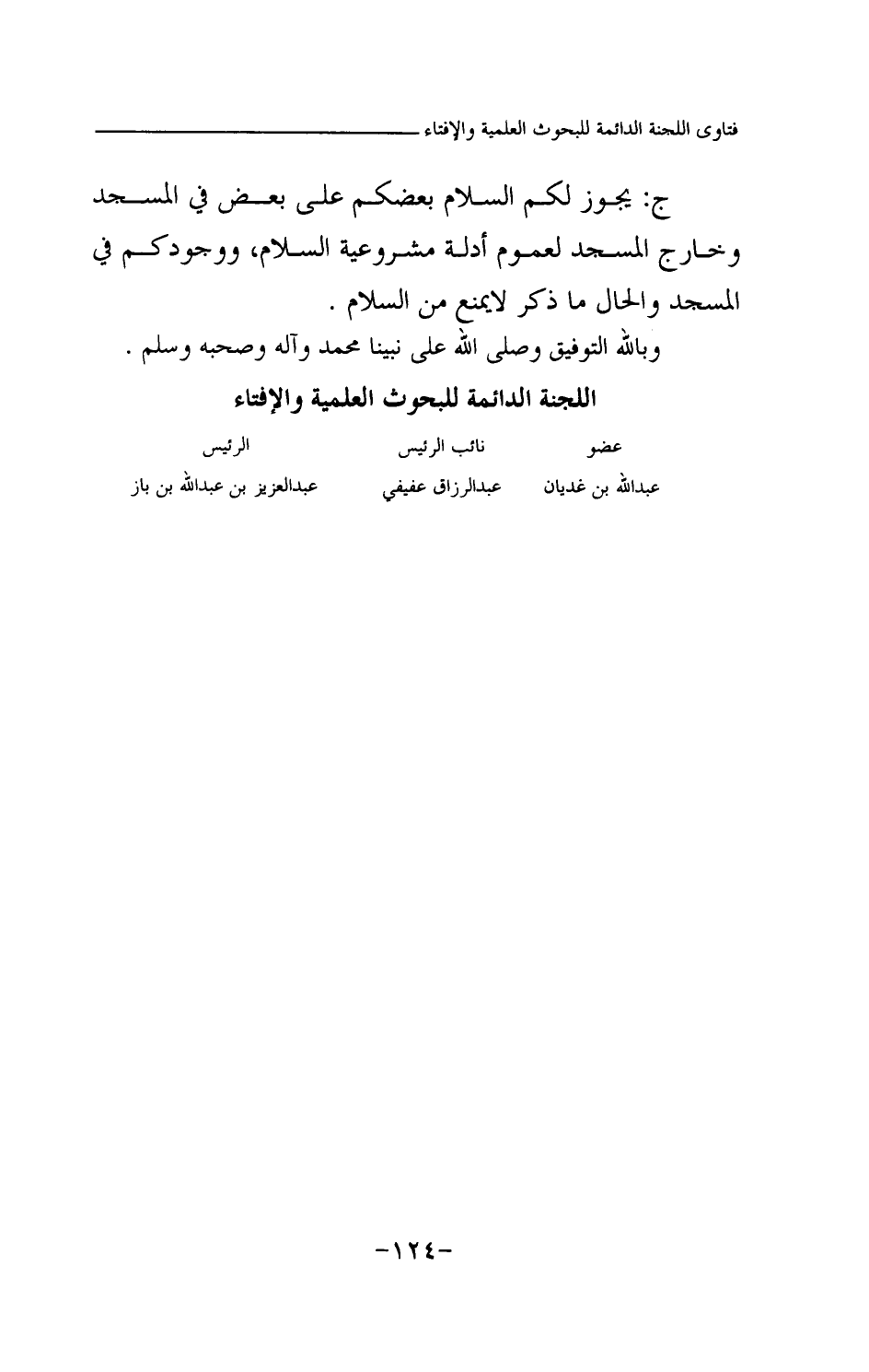 ج: يجوز لكم السلام بعضكم على بعض في المسجد وخارج المسجد لعموم أدلة مشروعية السلام، ووجودكم في المسجد والحال ما ذكر لا يمنع من السلام.