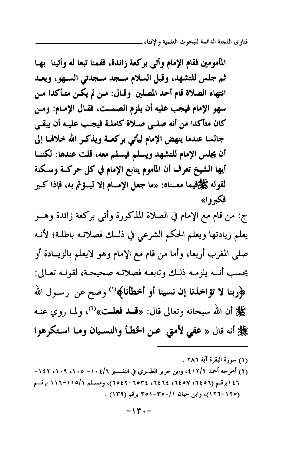 ج: من قام مع الإمام في الصلاة المذكورة وأتى بركعة زائدة وهو يعلم زيادتها ويعلم الحكم الشرعي في ذلك فصلاته باطلة؛ لأنه صلى المغرب أربعا، وأما من قام مع الإمام وهو لا يعلم بالزيادة أو يحسب أنه يلزمه ذلك وتابعه فصلاته صحيحة، لقوله تعالى: {رَبَّنَا لَا تُؤَاخِذْنَا إِنْ نَسِينَا أَوْ أَخْطَأْنَا} (¬1) وصح عن رسول الله صلى الله عليه وسلم «أن الله سبحانه وتعالى قال: قد فعلت (¬2) » ولما