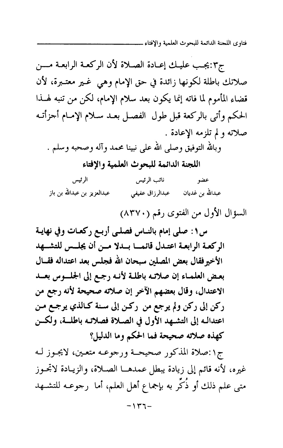 س1: صلى إمام بالناس فصلى أربع ركعات وفي نهاية الركعة الرابعة اعتدل قائما بدلا من أن يجلس للتشهد الأخير فقال بعض المصلين: سبحان الله فجلس بعد اعتداله فقال بعض العلماء: إن صلاته باطلة لأنه رجع إلى الجلوس بعد الاعتدال، وقال بعضهم الآخر: إن صلاته صحيحة لأنه رجع من ركن إلى ركن ولم يرجع من ركن إلى سنة كالذي يرجع من اعتداله