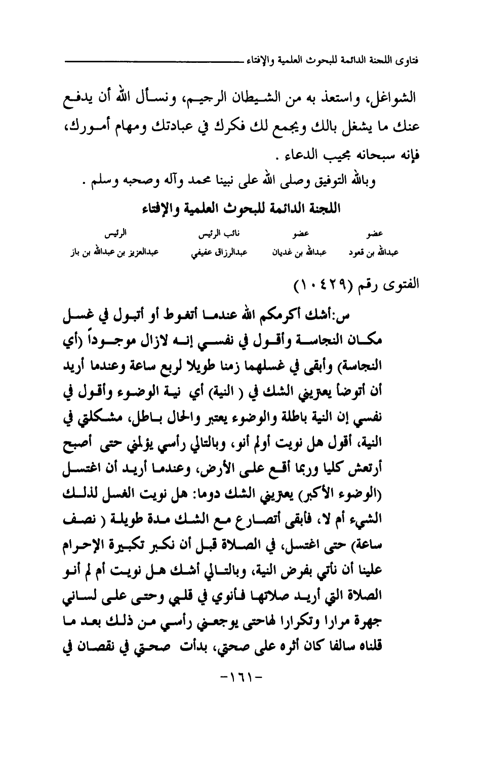 س: أشك أكرمكم الله عندما أتغوط أو أتبول في غسل مكان النجاسة وأقول في نفسي إنه لا زال موجودا (أي النجاسة) وأبقى في غسلهما زمنا طويلا لربع ساعة وعندما أريد أن أتوضأ يعتريني الشك في (النية) أي نية الوضوء وأقول في نفسي إن النية باطلة والوضوء يعتبر والحال باطل، مشكلتي في النية، أقول هل نويت أولم أنو، وبالتالي رأسي يؤلمني حتى أصبح أرتعش كليا وربما أقع على الأرض، وعندما أريد أن اغتسل (الوضوء الأكبر) يعتريني الشك دوما: هل نويت الغسل لذلك الشيء أم لا، فأبقى أتصارع مع الشك مدة طويلة (نصف ساعة) حتى اغتسل، في الصلاة قبل أن نكبر تكبيرة الإحرام علينا أن نأتي بفرض النية، وبالتالي أشك هل نويت أم لم أنو الصلاة التي أريد صلاتها فأنوي في قلبي وحتى على لساني جهرة مرارا وتكرارا لها حتى يوجعني رأسي من ذلك بعد ما