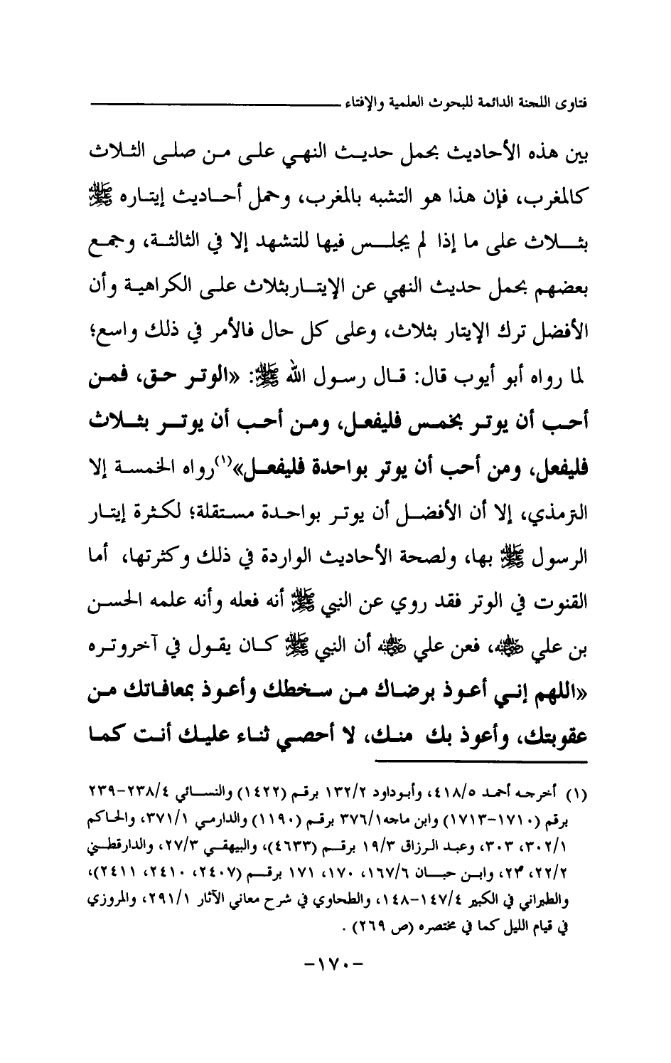 المغرب (¬1) » رواه الدارقطني بإسناده وقال: كلهم ثقات، وقد جمع بعض العلماء بين هذه الأحاديث بحمل حديث النهي على من صلى الثلاث كالمغرب، فإن هذا هو التشبه بالمغرب، وحمل أحاديث إيتاره صلى الله عليه وسلم بثلاث على ما إذا لم يجلس فيها للتشهد إلا في الثالثة، وجمع بعضهم بحمل حديث النهي عن الإيتار بثلاث على الكراهية وأن الأفضل ترك الإيتار بثلاث، وعلى كل حال فالأمر في ذلك واسع؛ لما رواه أبو أيوب قال: قال رسول الله صلى الله عليه وسلم: «الوتر حق، فمن أحب أن يوتر بخمس فليفعل، ومن أحب أن يوتر بثلاث فليفعل، ومن أحب أن يوتر بواحدة فليفعل (¬2) » رواه الخمسة إلا الترمذي إلا أن الأفضل أن يوتر بواحدة مستقلة؛ لكثرة إيتار الرسول صلى الله عليه وسلم بها، ولصحة الأحاديث الواردة في ذلك