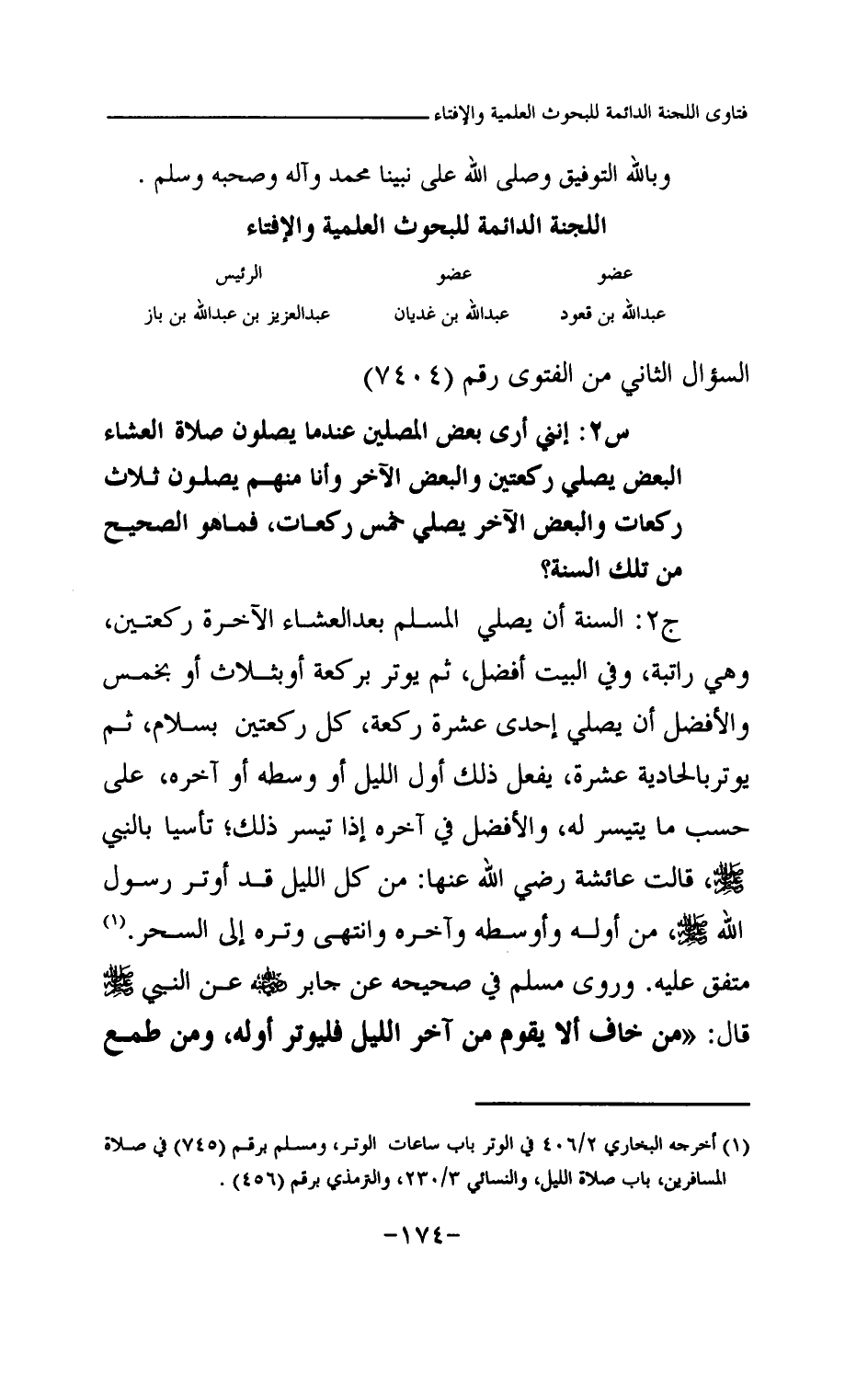 ج2: السنة أن يصلي المسلم بعد العشاء الآخرة ركعتين، وهي راتبة، وفي البيت أفضل، ثم يوتر بركعة أو بثلاث أو بخمس والأفضل أن يصلي إحدى عشرة ركعة، كل ركعتين بسلام، ثم يوتر بالحادية عشرة، يفعل ذلك أول الليل أو وسطه أو آخره، على حسب ما يتيسر له، والأفضل في آخره إذا تيسر ذلك؛ تأسيا بالنبي صلى الله عليه وسلم، قالت عائشة رضي الله عنها: «من كل الليل قد أوتر رسول الله صلى الله عليه وسلم، من أوله وأوسطه وآخره وانتهى وتره إلى