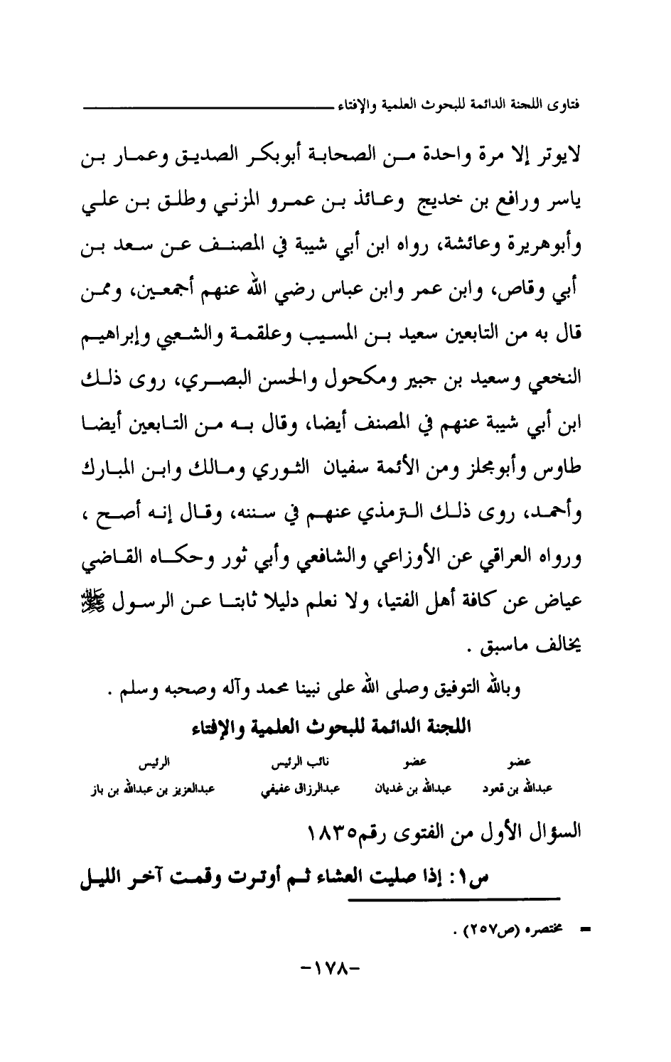 (¬1) رواه بهذا اللفظ عبد الرزاق 3 / 14 برقم (4615-4616) ، والطحاوي في شرح معاني الآثار 1 / 342 وروي بألفاظ متقاربة تعود إلى معنى واحد، منها ما عند أحمد 1 / 330، وأبو داود 2 / 139 برقم (1434) ، وابن ماجه 1 / 379 برقم (1202) ، والحاكم 1 / 301، والبيهقي 3 / 35، 36، وابن خزيمة 2 / 145- 146 برقم (1084-1085) وابن حبان 6 / 199 برقم (2446) وعبد الرزاق 3 / 14برقم (4617) وابن أبي شيبة 2 / 282، والطيالسي (ص 233) برقم (1671) والمروزي في قيام الليل كما في مختصره (ص257) .