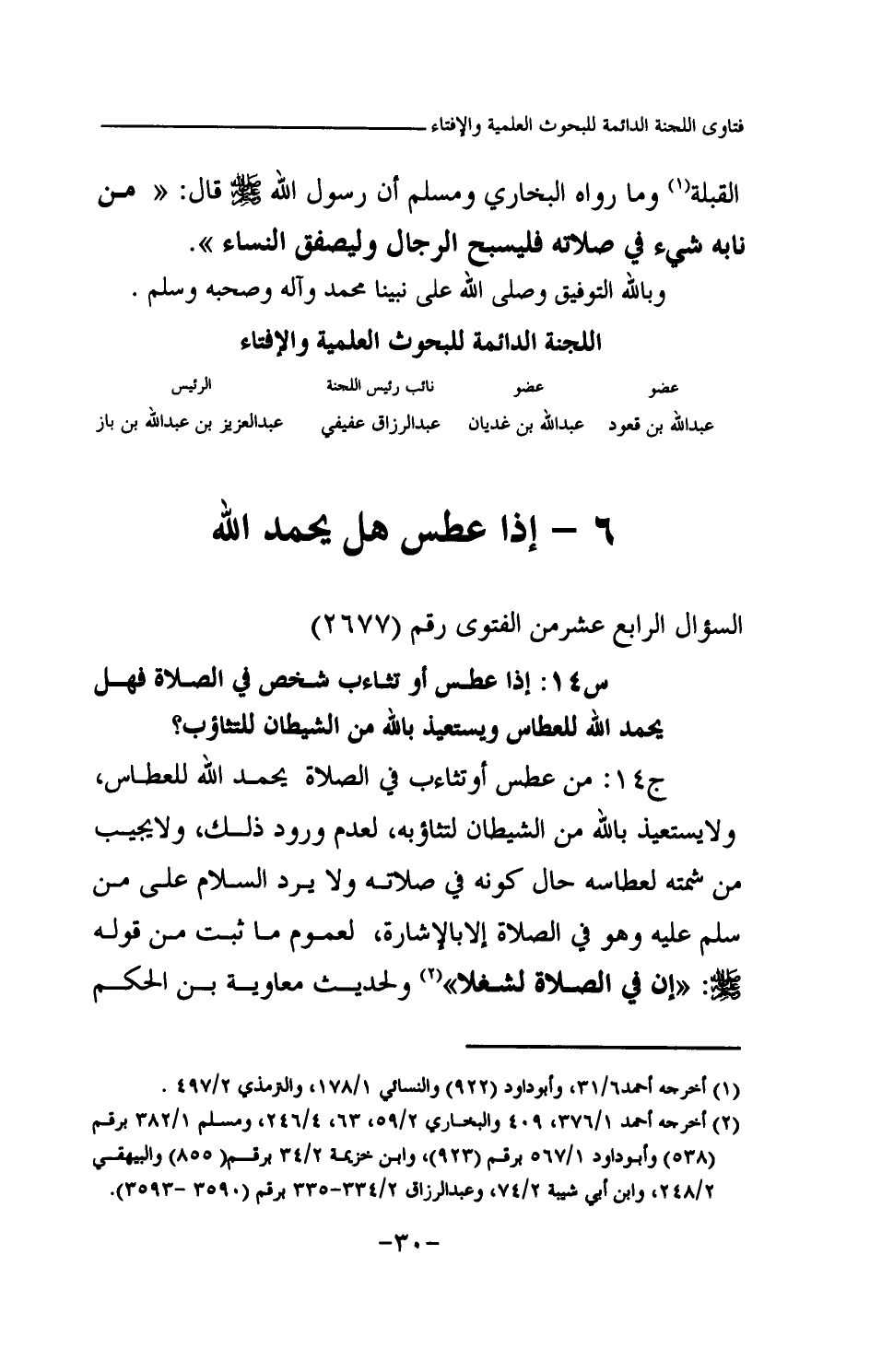 س14: إذا عطس أو تثاءب شخص في الصلاة فهل يحمد الله للعطاس ويستعيذ بالله من الشيطان للتثاؤب؟