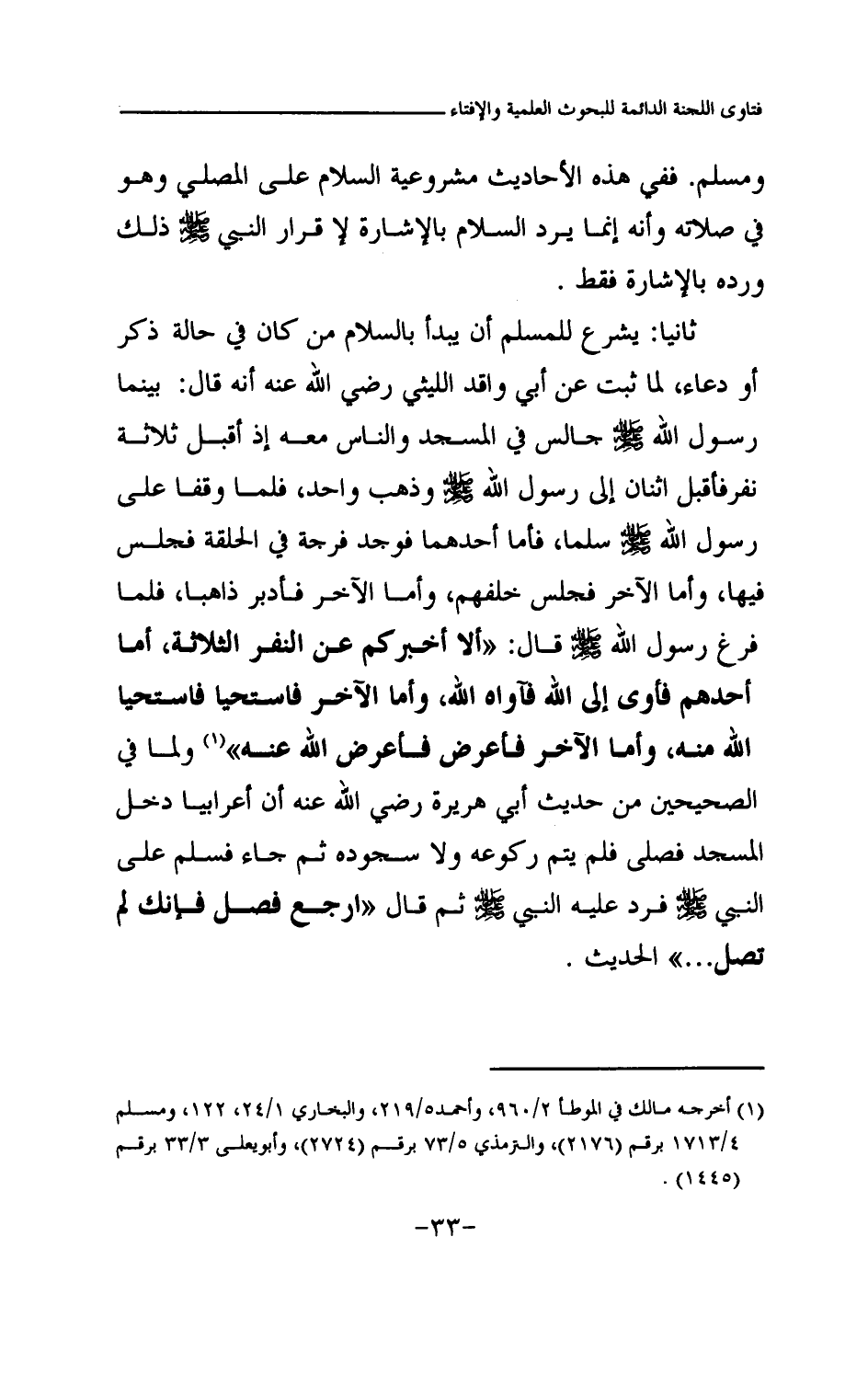 ومسلم ففي هذه الأحاديث مشروعية السلام على المصلي وهو في صلاته وأنه إنما يرد السلام بالإشارة لإقرار النبي صلى الله عليه وسلم ذلك ورده بالإشارة فقط.