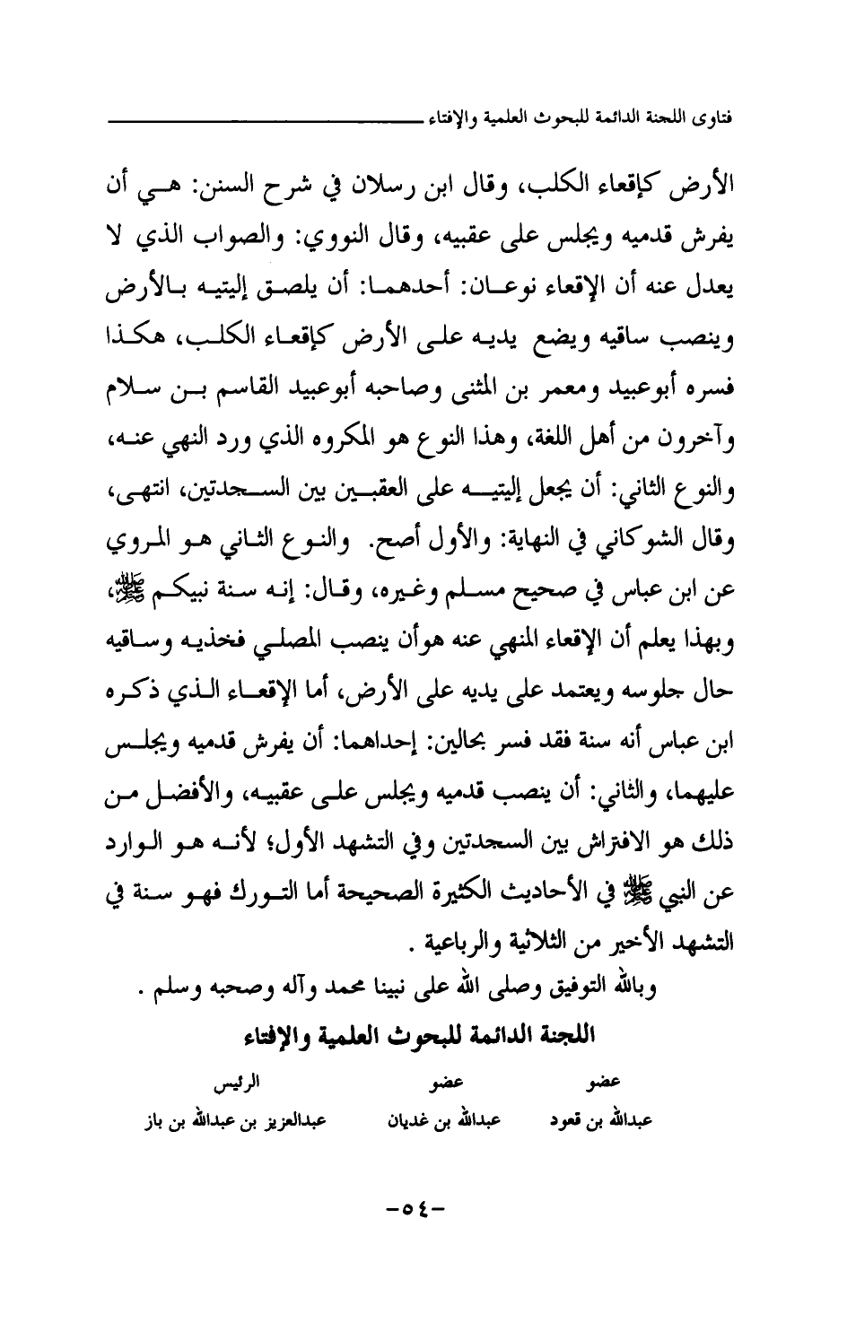 الأرض كإقعاء الكلب، وقال ابن رسلان في شرح السنن: هي أن يفرش قدميه ويجلس على عقبيه، وقال النووي: والصواب الذي لا يعدل عنه أن الإقعاء نوعان: أحدهما: أن يلصق إليتيه بالأرض وينصب ساقيه ويضع يديه على الأرض كإقعاء الكلب، هكذا فسره أبو عبيد ومعمر بن المثنى وصاحبه أبو عبيد القاسم بن سلام وآخرون من أهل اللغة، وهذا النوع هو المكروه الذي ورد النهي عنه، والنوع الثاني: أن يجعل إليتيه على العقبين بين السجدتين، انتهى، وقال الشوكاني في النهاية: والأول أصح. والنوع الثاني هو المروي عن ابن عباس في صحيح مسلم وغيره، وقال: إنه سنة نبيكم صلى الله عليه وسلم، وبهذا يعلم أن الإقعاء المنهي عنه هو أن ينصب المصلي فخذيه وساقيه حال جلوسه ويعتمد على يديه على الأرض، أما الإقعاء الذي ذكره ابن عباس أنه سنة فقد فسر بحالين: إحداهما: أن يفرش قدميه ويجلس عليهما، والثاني: أن ينصب قدميه ويجلس على عقبيه، والأفضل من ذلك هو الافتراش بين السجدتين وفي التشهد الأول؛ لأنه هو الوارد عن النبي صلى الله عليه وسلم في الأحاديث الكثيرة الصحيحة أما التورك فهو سنة في التشهد الأخير من الثلاثية والرباعية.