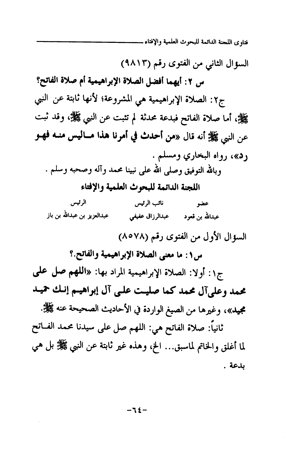 ج2: الصلاة الإبراهيمية هي المشروعة؛ لأنها ثابتة عن النبي صلى الله عليه وسلم، أما صلاة الفاتح فبدعة محدثة لم تثبت عن النبي صلى الله عليه وسلم، وقد ثبت عن النبي صلى الله عليه وسلم أنه قال «من أحدث في أمرنا هذا ما ليس منه فهو رد (¬1) » رواه البخاري ومسلم.