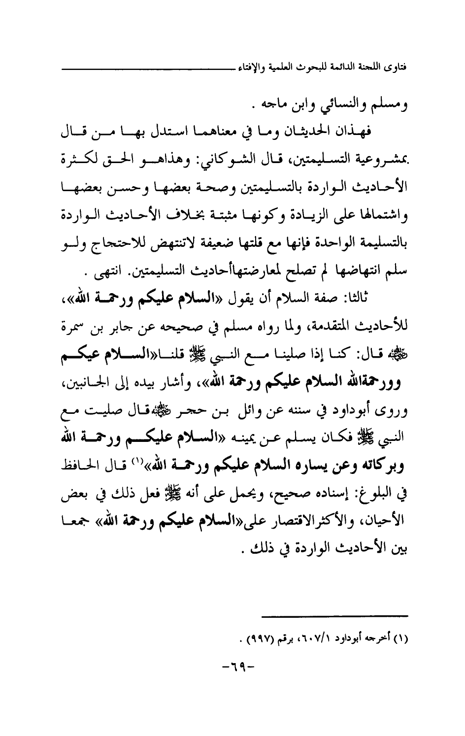 عن يمينه وعن يساره حتى يرى بياض خده (¬1) » رواه أحمد ومسلم والنسائي وابن ماجه. فهذان الحديثان وما في معناهما استدل بها من قال بمشروعية التسليمتين، قال الشوكاني: وهذا هو الحق لكثرة الأحاديث الواردة بالتسليمتين وصحة بعضها وحسن بعضها واشتمالها على الزيادة وكونها مثبتة بخلاف الأحاديث الواردة بالتسليمة الواحدة فإنها مع قلتها ضعيفة لا تنتهض للاحتجاج ولو سلم انتهاضها لم تصلح لمعارضتها أحاديث التسليمتين. انتهى.