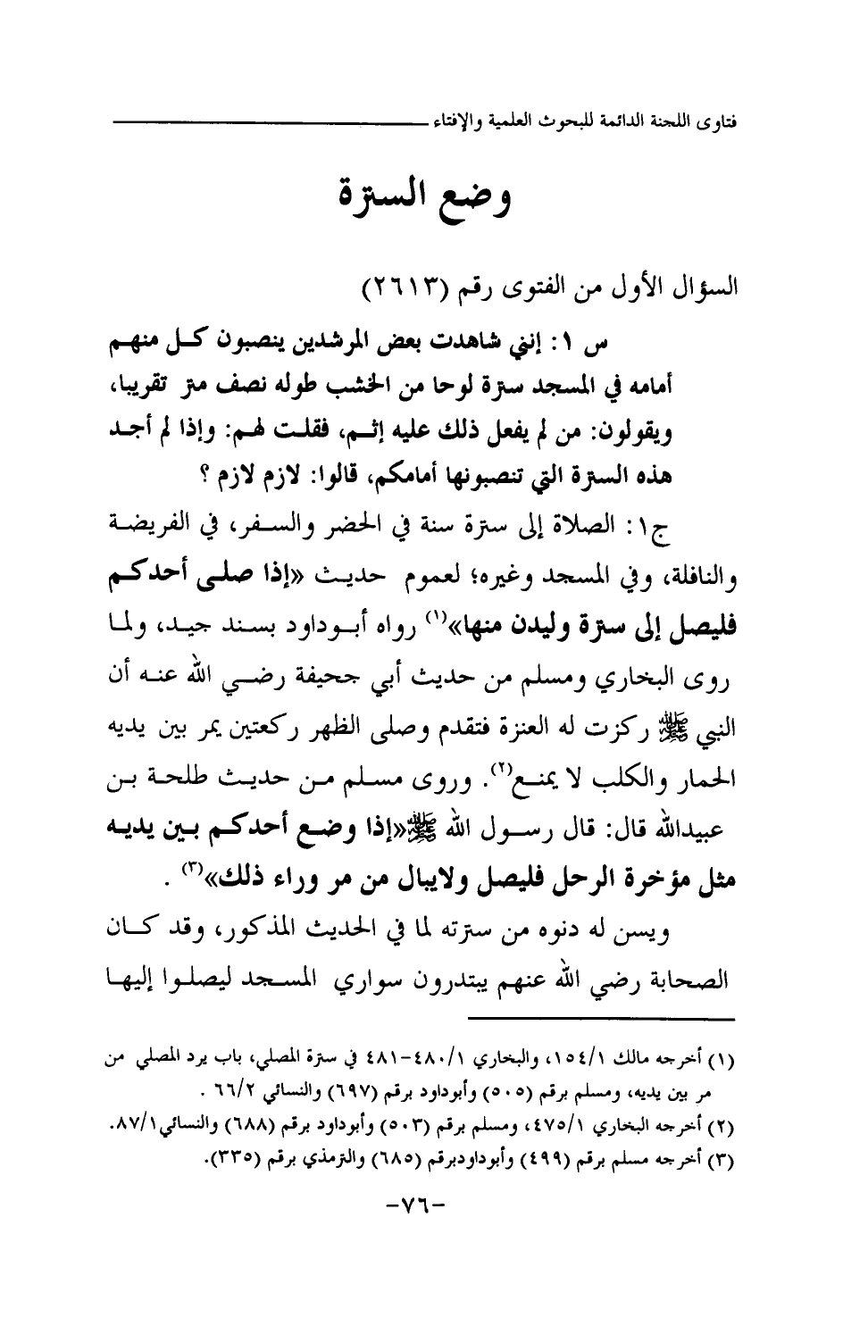 ج1: الصلاة إلى سترة سنة في الحضر والسفر، في الفريضة والنافلة، وفي المسجد وغيره؛ لعموم حديث «إذا صلى أحدكم فليصل إلى سترة وليدن منها (¬1) » رواه أبو داود بسند جيد ولما روى البخاري ومسلم من حديث أبي جحيفة رضي الله عنه «أن النبي صلى الله عليه وسلم ركزت له العنزة فتقدم وصلى الظهر ركعتين يمر بين يديه الحمار والكلب لا يمنع (¬2) » وروى مسلم من حديث طلحة بن عبيد الله قال: قال رسول الله صلى الله عليه وسلم «إذا وضع أحدكم بين يديه مثل مؤخرة الرحل فليصل ولا يبال من مر وراء ذلك (¬3) »