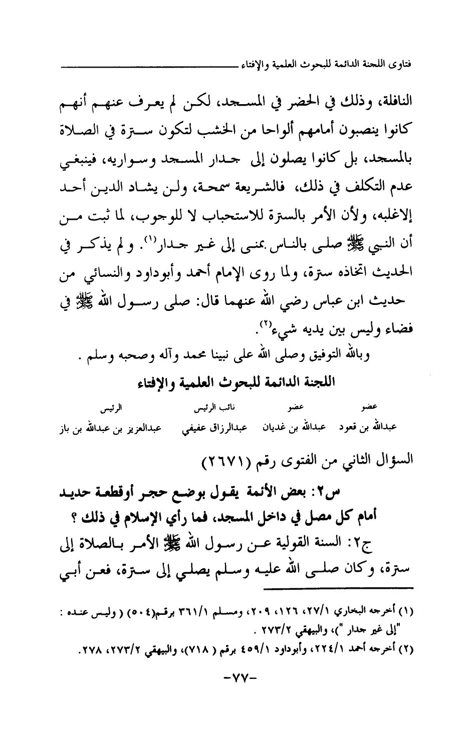 الصحابة رضي الله عنهم يبتدرون سواري المسجد ليصلوا إليها النافلة، وذلك في الحضر في المسجد، لكن لم يعرف عنهم أنهم كانوا ينصبون أمامهم ألواحا من الخشب لتكون سترة في الصلاة بالمسجد، بل كانوا يصلون إلى جدار المسجد وسواريه، فينبغي عدم التكلف في ذلك، فالشريعة سمحة، ولن يشاد الدين أحد إلا غلبه، ولأن الأمر بالسترة للاستحباب لا للوجوب، لما ثبت من «أن النبي صلى الله عليه وسلم صلى بالناس بمنى إلى غير جدار (¬1) » ولم يذكر في الحديث اتخاذه سترة، ولما روى الإمام أحمد وأبو داود والنسائي من حديث ابن عباس رضي الله عنهما قال: «صلى رسول الله صلى الله عليه وسلم في فضاء وليس بين يديه شيء (¬2) »
