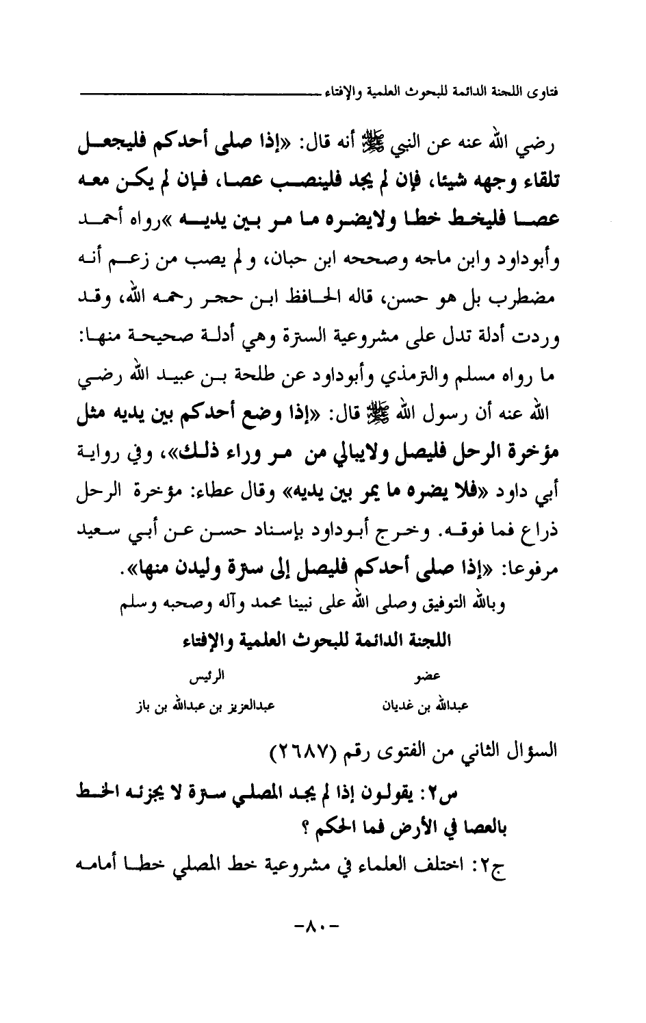 ج6: نعم يجوز ذلك، والأصل في ذلك حديث أبي هريرة رضي الله عنه عن النبي صلى الله عليه وسلم أنه قال: «إذا صلى أحدكم فليجعل تلقاء وجهه شيئا، فإن لم يجد فلينصب عصا، فإن لم يكن معه عصا فليخط خطا ولا يضره ما مر بين يديه (¬1) » رواه أحمد وأبو داود وابن ماجه وصححه ابن حبان ولم يصب من زعم أنه مضطرب بل هو حسن، قاله الحافظ ابن حجر رحمه الله، وقد وردت أدلة تدل على مشروعية السترة وهي أدلة صحيحة منها: ما رواه مسلم والترمذي وأبو داود عن طلحة بن عبيد الله رضي الله عنه أن رسول الله صلى الله عليه وسلم قال: «إذا وضع أحدكم بين يديه مثل مؤخرة الرحل فليصل ولا يبالي من مر وراء ذلك (¬2) » وفي رواية أبي داود «فلا يضره ما يمر بين يديه (¬3) » وقال عطاء: مؤخرة الرحل ذراع فما فوقه. وخرج أبو داود بإسناد حسن عن أبي سعيد مرفوعا: «إذا صلى أحدكم فليصل إلى سترة وليدن منها (¬4) »