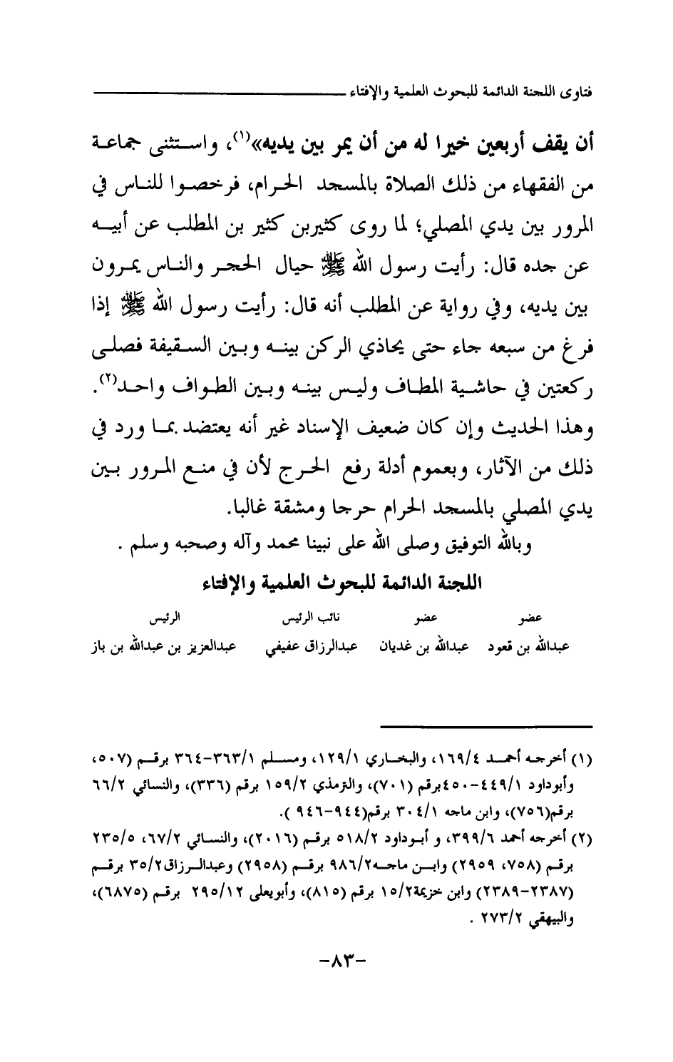 ج 6: يحرم المرور بين يدي المصلي، سواء اتخذ سترة أم لا، لعموم حديث: «لو يعلم المار بين يدي المصلي ماذا عليه لكان أن يقف أربعين خيرا له من أن يمر بين يديه (¬1) » واستثنى جماعة من الفقهاء من ذلك الصلاة بالمسجد الحرام، فرخصوا للناس في المرور بين يدي المصلي؛ لما روى كثير بن كثير بن المطلب عن أبيه عن جده قال: «رأيت رسول الله صلى الله عليه وسلم حيال الحجر والناس يمرون بين يديه (¬2) » ، وفي رواية عن المطلب أنه قال: «رأيت رسول الله صلى الله عليه وسلم إذا فرغ من سبعه جاء حتى يحاذي الركن بينه وبين السقيفة فصلى ركعتين في حاشية المطاف وليس بينه وبين الطواف واحد (¬3) » وهذا الحديث وإن كان ضعيف الإسناد غير أنه يعتضد بما ورد في ذلك من الآثار، وبعموم أدلة رفع الحرج لأن في منع المرور بين يدي المصلي بالمسجد الحرام حرجا ومشقة غالبا.