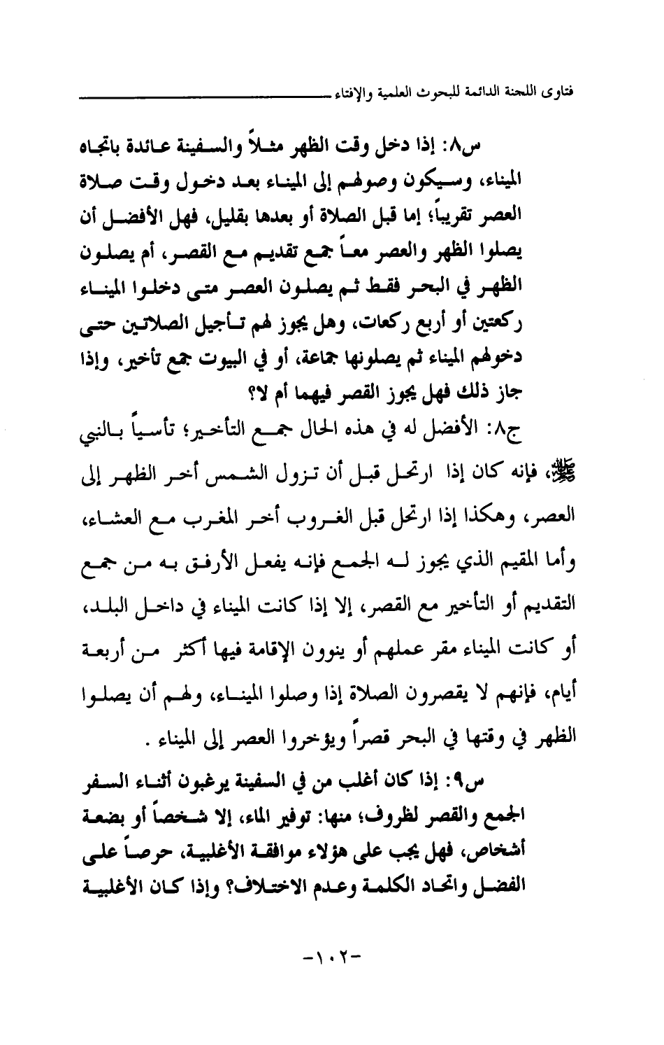س8: إذا دخل وقت الظهر مثلا والسفينة عائدة باتجاه الميناء، وسيكون وصولهم إلى الميناء بعد دخول وقت صلاة العصر تقريبا؛ إما قبل الصلاة أو بعدها بقليل، فهل الأفضل أن يصلوا الظهر والعصر معا جمع تقديم مع القصر، أم يصلون الظهر في البحر فقط ثم يصلون العصر متى دخلوا الميناء ركعتين أو أربع ركعات، وهل يجوز لهم تأجيل الصلاتين حتى دخولهم الميناء ثم يصلونها جماعة، أو في البيوت جمع تأخير، وإذا جاز ذلك فهل يجوز القصر فيهما أم لا؟