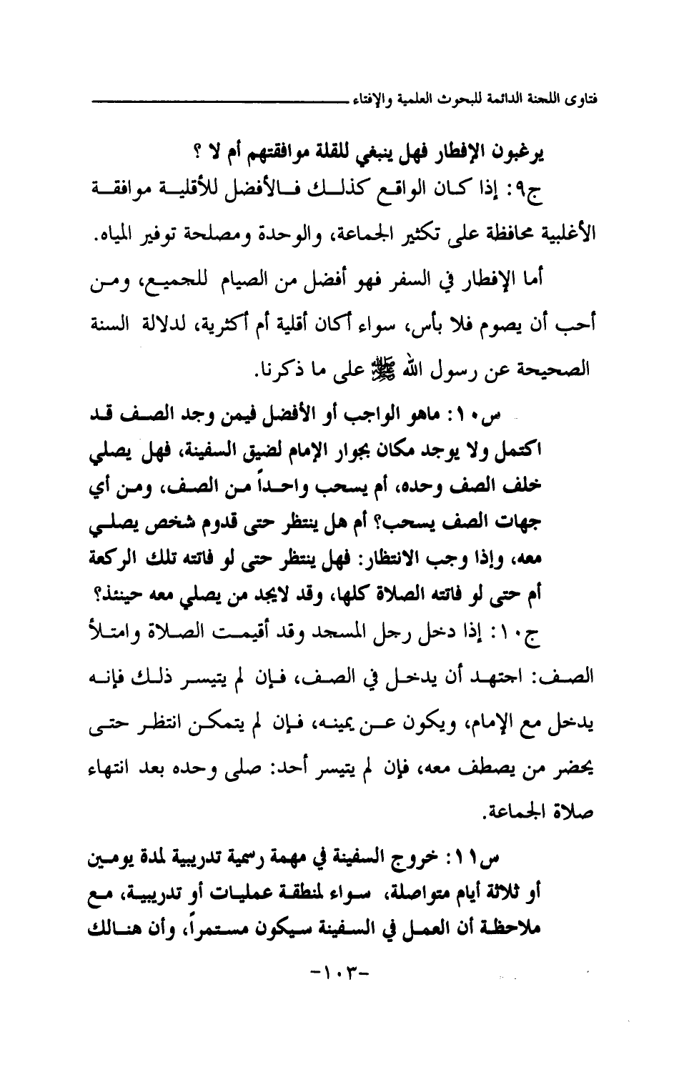 س10: ما هو الواجب أو الأفضل فيمن وجد الصف قد اكتمل ولا يوجد مكان بجوار الإمام لضيق السفينة، فهل يصلي خلف الصف وحده، أم يسحب واحدا من الصف، ومن أي جهات الصف يسحب؟ أم هل ينتظر حتى قدوم شخص يصلي معه، وإذا وجب الانتظار: فهل ينتظر حتى لو فاتته تلك الركعة أم حتى لو فاتته الصلاة كلها، وقد لا يجد من يصلي معه حينئذ؟