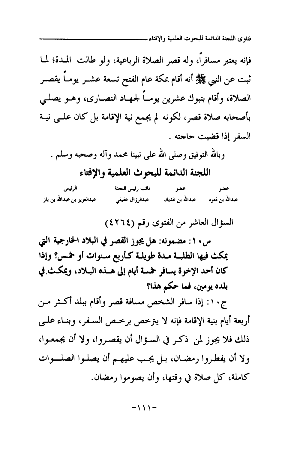 س10: مضمونه: هل يجوز القصر في البلاد الخارجية التي يمكث فيها الطلبة مدة طويلة كأربع سنوات أو خمس؟ وإذا كان أحد الإخوة يسافر خمسة أيام إلى هذه البلاد، ويمكث في بلده يومين، فما حكم هذا؟