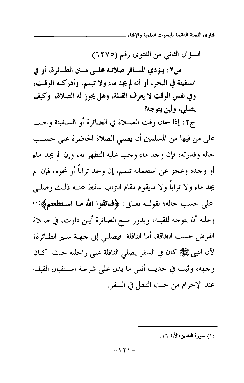 ج2: إذا حان وقت الصلاة في الطائرة أو السفينة وجب على من فيها من المسلمين أن يصلي الصلاة الحاضرة على حسب حاله وقدرته، فإن وجد ماء وجب عليه التطهر به، وإن لم يجد ماء أو وجده وعجز عن استعماله تيمم، إن وجد ترابا أو نحوه، فإن لم يجد ماء ولا ترابا ولا ما يقوم مقام التراب سقط عنه ذلك وصلى على حسب حاله؛ لقوله تعالى: {فَاتَّقُوا اللَّهَ مَا اسْتَطَعْتُمْ} (¬1) وعليه أن يتوجه للقبلة، ويدور مع الطائرة أين دارت، في صلاة الفرض حسب الطاقة، أما النافلة فيصلي إلى جهة سير الطائرة؛ لأن النبي صلى الله عليه وسلم كان في السفر يصلي النافلة على راحلته حيث كان وجهه، وثبت في حديث أنس ما يدل على شرعية استقبال القبلة عند الإحرام من حيث التنفل في السفر.
