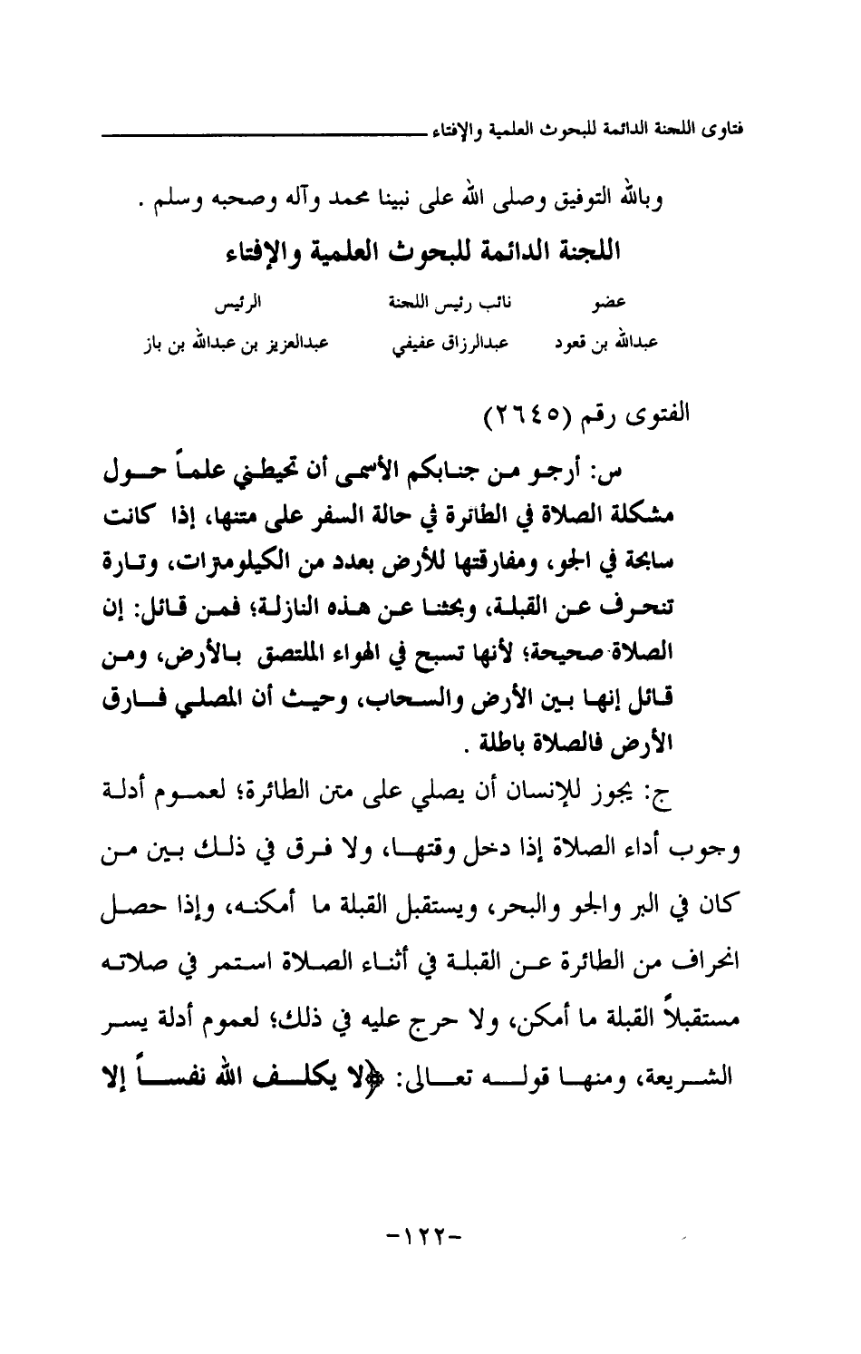 س: أرجو من جنابكم الأسمى أن تحيطني علما حول مشكلة الصلاة في الطائرة في حالة السفر على متنها، إذا كانت سابحة في الجو، ومفارقتها للأرض بعدد من الكيلو مترات، وتارة تنحرف عن القبلة، وبحثنا عن هذه النازلة؛ فمن قائل: إن الصلاة صحيحة؛ لأنها تسبح في الهواء الملتصق بالأرض، ومن قائل إنها بين الأرض والسحاب، وحيث إن المصلي فارق الأرض فالصلاة باطلة.