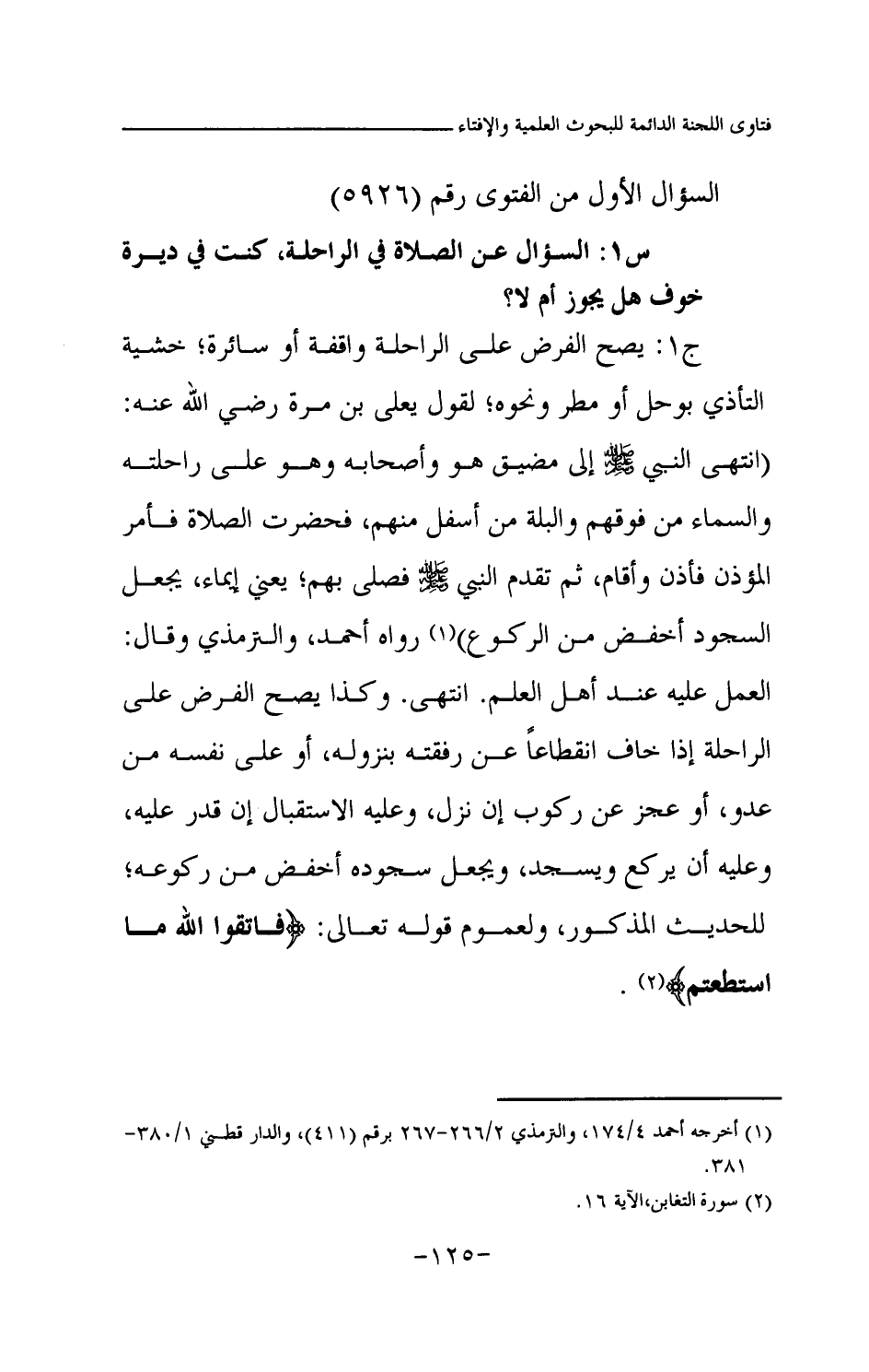 س1: السؤال عن الصلاة في الراحلة، كنت في ديرة خوف هل يجوز أم لا؟