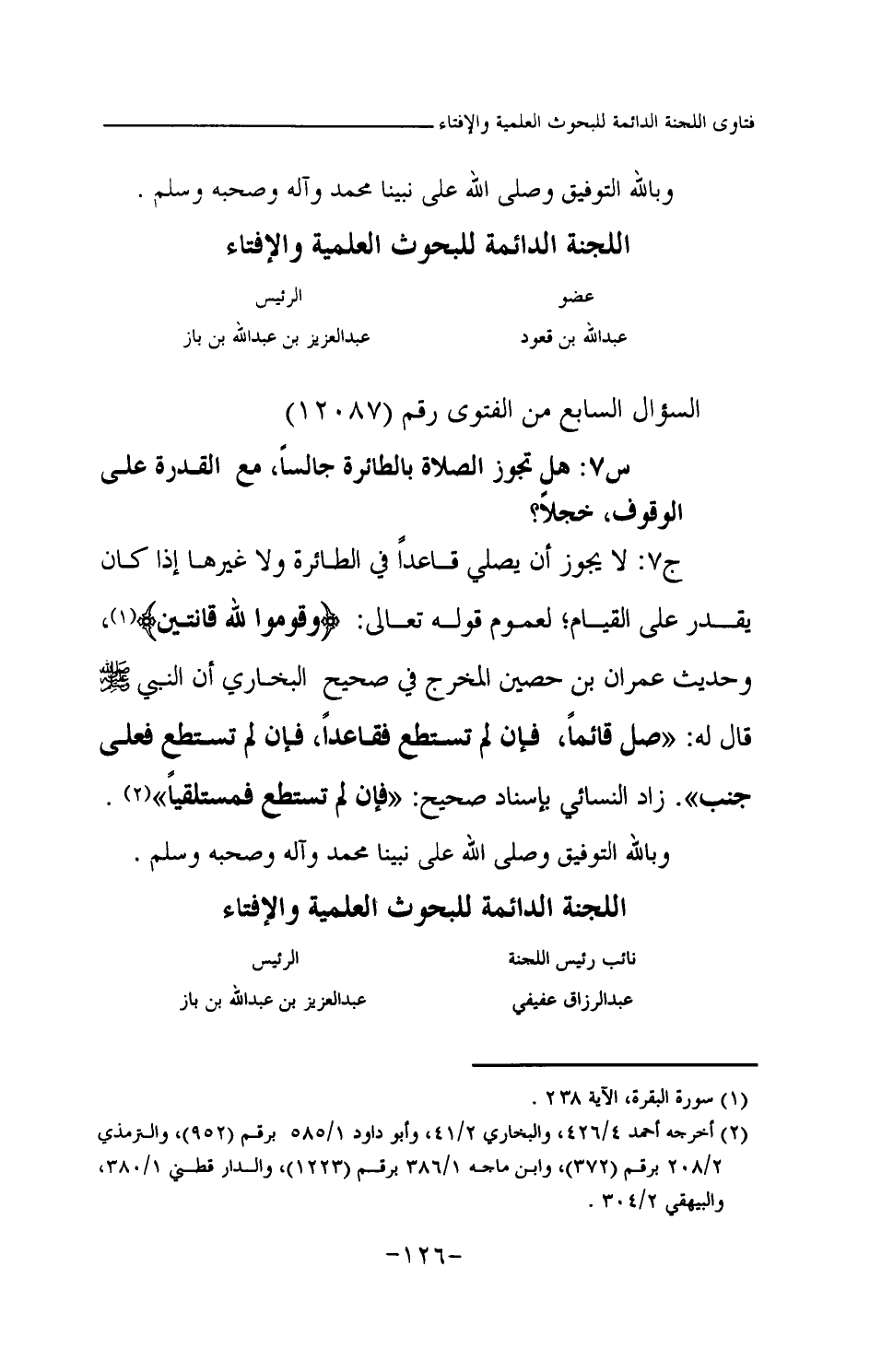 ج7: لا يجوز أن يصلي قاعدا في الطائرة ولا غيرها إذا كان يقدر على القيام؛ لعموم قوله تعالى: {وَقُومُوا لِلَّهِ قَانِتِينَ} (¬1) وحديث عمران بن حصين المخرج في صحيح البخاري أن النبي صلى الله عليه وسلم قال له: «صل قائما، فإن لم تستطع فقاعدا، فإن لم تستطع فعلى جنب (¬2) » زاد النسائي بإسناد صحيح: «فإن لم تستطع فمستلقيا (¬3) »