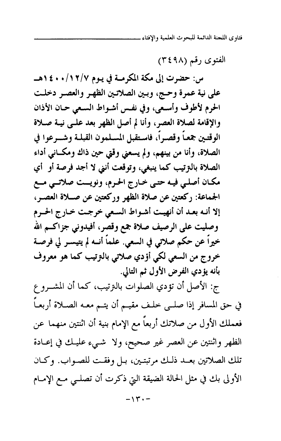 س: حضرت إلى مكة المكرمة في يوم 7 \ 12 \ 1400هـ على نية عمرة وحج، وبين الصلاتين الظهر والعصر دخلت الحرم لأطوف وأسعى، وفي نفس أشواط السعي حان الأذان والإقامة لصلاة العصر، وأنا لم أصل الظهر بعد على نية صلاة الوقتين جمعا وقصرا، فاستقبل المسلمون القبلة وشرعوا في الصلاة، وأنا من بينهم، ولم يسعني وقتي حين ذاك ومكاني أداء الصلاة بالترتيب كما ينبغي، وتوقعت أنني لا أجد فرصة أو أي مكان أصلي فيه حتى خارج الحرم، ونويت صلاتي مع الجماعة: ركعتين عن صلاة الظهر وركعتين عن صلاة العصر، إلا أنه بعد أن أنهيت أشواط السعي خرجت خارج الحرم وصليت على الرصيف صلاة جمع وقصر، أفيدوني جزاكم الله خيرا عن حكم صلاتي في السعي. علما أنه لم يتيسر لي فرصة خروج من السعي لكي أؤدي صلاتي بالترتيب كما هو معروف بأنه يؤدي الفرض الأول ثم التالي.