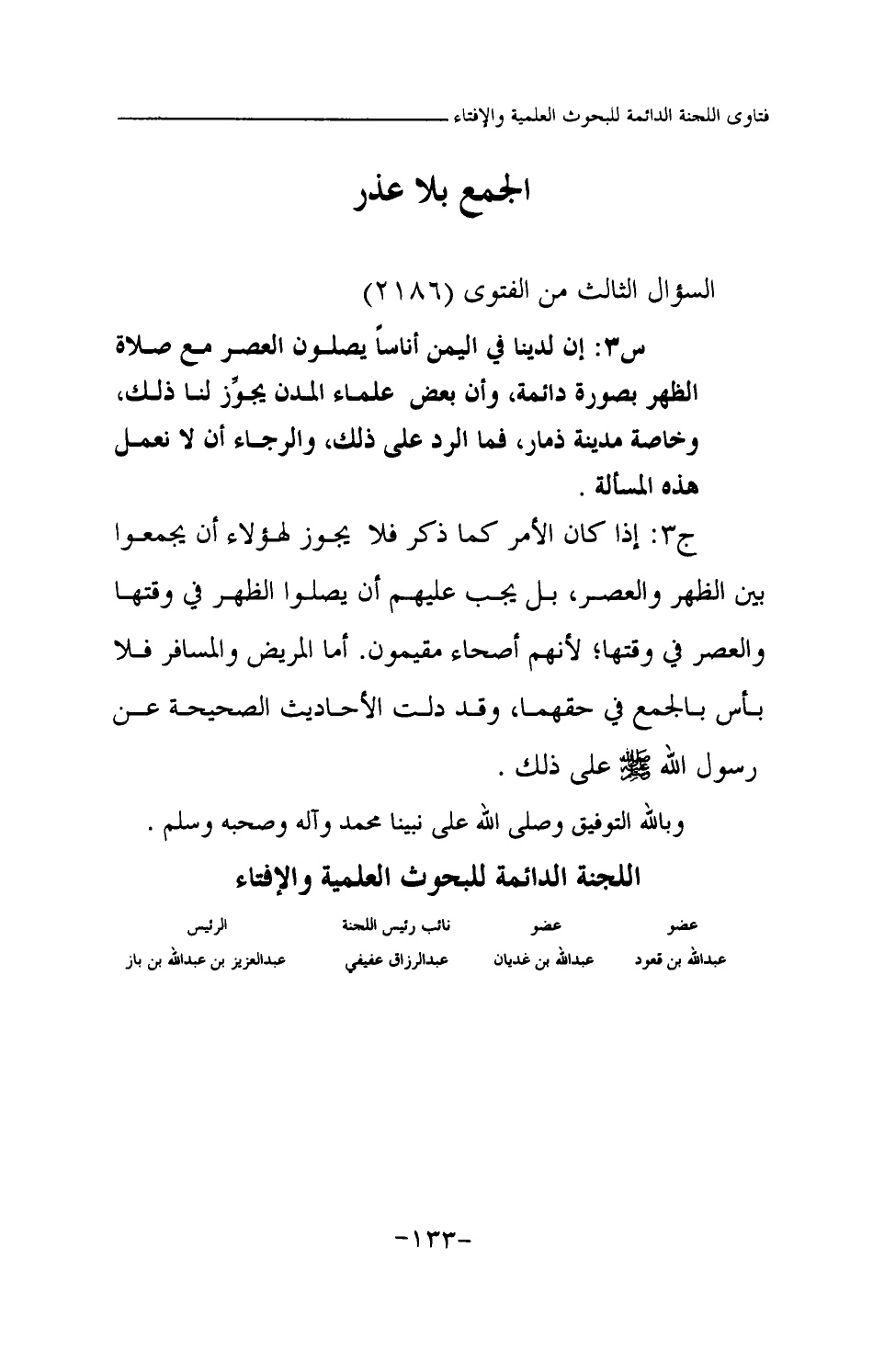 س3: إن لدينا في اليمن أناسا يصلون العصر مع صلاة الظهر بصورة دائمة، وأن بعض علماء المدن يجوز لنا ذلك، وخاصة مدينة ذمار، فما الرد على ذلك، والرجاء أن لا نعمل هذه المسألة.