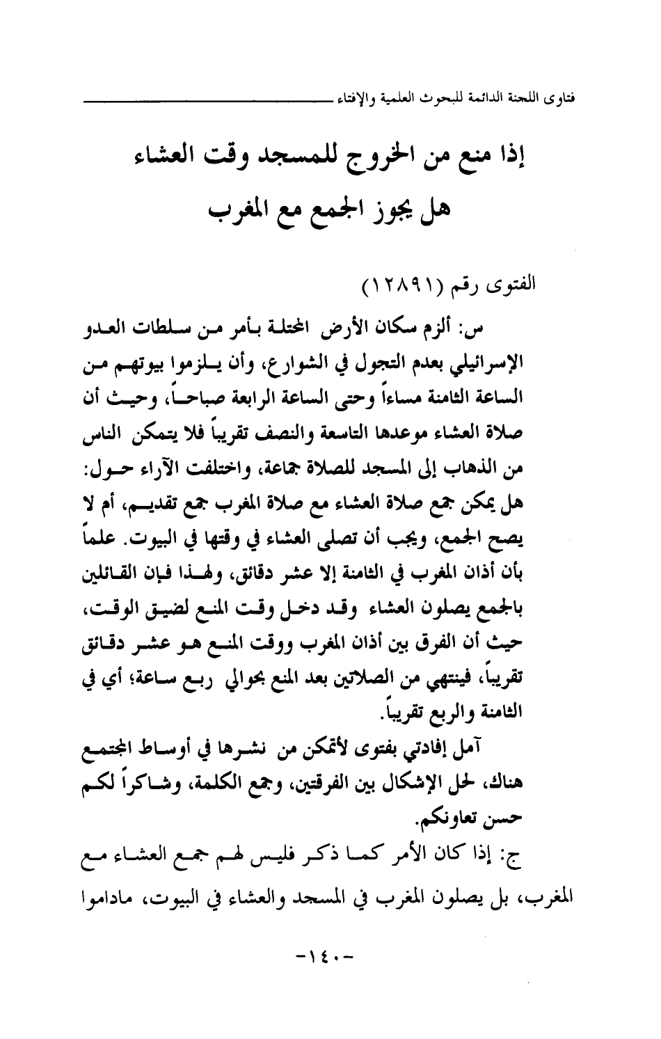 س: ألزم سكان الأرض المحتلة بأمر من سلطات العدو الإسرائيلي بعدم التجول في الشوارع، وأن يلزموا بيوتهم من الساعة الثامنة مساءا وحتى الساعة الرابعة صباحا، وحيث أن صلاة العشاء موعدها التاسعة والنصف تقريبا فلا يتمكن الناس من الذهاب إلى المسجد للصلاة جماعة، واختلفت الآراء حول: هل يمكن جمع صلاة العشاء مع صلاة المغرب جمع تقديم، أم لا يصح الجمع، ويجب أن تصلى العشاء في وقتها في البيوت. علما بأن أذان المغرب في الثامنة إلا عشر دقائق، ولهذا فإن القائلين بالجمع يصلون العشاء وقد دخل وقت المنع لضيق الوقت، حيث إن الفرق بين أذان المغرب ووقت المنع هو عشر دقائق تقريبا، فينتهي من الصلاتين بعد المنع بحوالي ربع ساعة؛ أي في الثامنة والربع تقريبا.