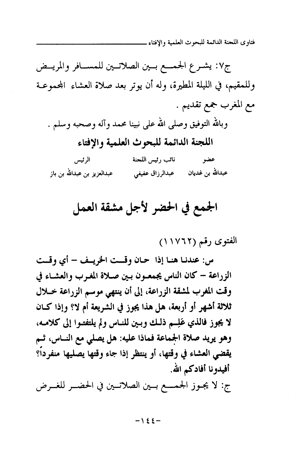 س: عندنا هنا إذا حان وقت الخريف -أي وقت الزراعة - كان الناس يجمعون بين صلاة المغرب والعشاء في وقت المغرب لمشقة الزراعة، إلى أن ينتهي موسم الزراعة خلال ثلاثة أشهر أو أربعة، هل هذا يجوز في الشريعة أم لا؟ وإذا كان لا يجوز فالذي علم ذلك وبين للناس ولم يلتفتوا إلى كلامه، وهو يريد صلاة الجماعة فماذا عليه: هل يصلي مع الناس، ثم يقضي العشاء في وقتها، أو ينتظر إذا جاء وقتها يصليها منفردا؟ أفيدونا أفادكم الله.