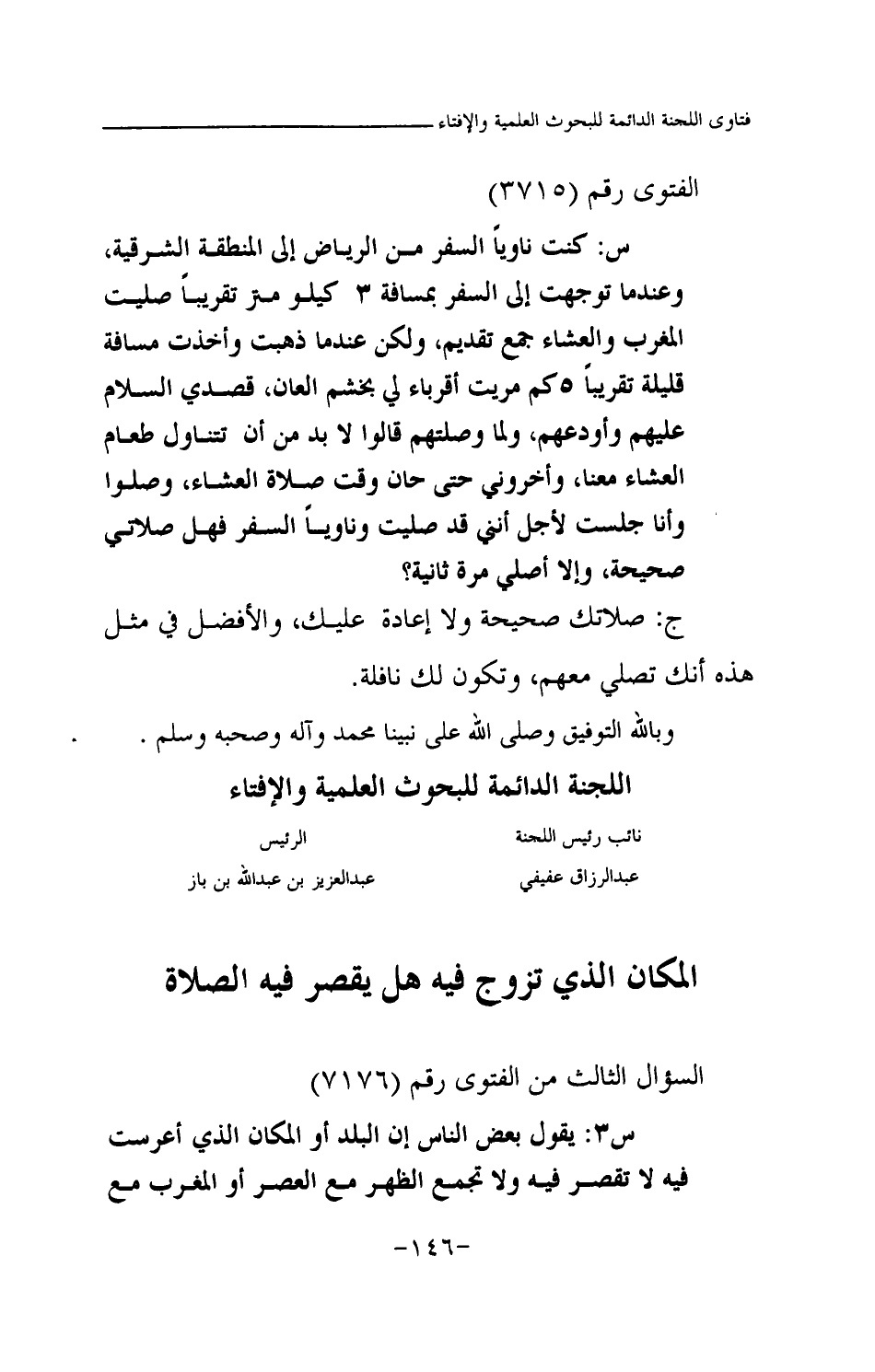س: كنت ناويا السفر من الرياض إلى المنطقة الشرقية، وعندما توجهت إلى السفر بمسافة 3 كيلو متر تقريبا صليت المغرب والعشاء جمع تقديم، ولكن عندما ذهبت وأخذت مسافة قليلة تقريبا 5كم مريت أقرباء لي بخشم العان، قصدي السلام عليهم وأودعهم، ولما وصلتهم قالوا لا بد من أن تتناول طعام العشاء معنا، وأخروني حتى حان وقت صلاة العشاء، وصلوا وأنا جلست لأجل أنني قد صليت وناويا السفر فهل صلاتي صحيحة، وإلا أصلي مرة ثانية؟